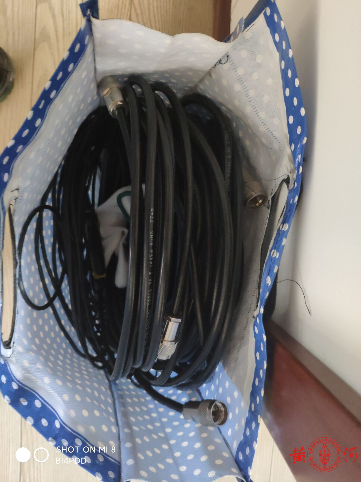 固定好巴伦,我把50-5的馈线顺着支撑杆用扎带绑了下,免得重力直接拖拽接头。毕竟20米长的馈线可不轻,再说万一刮风呢。