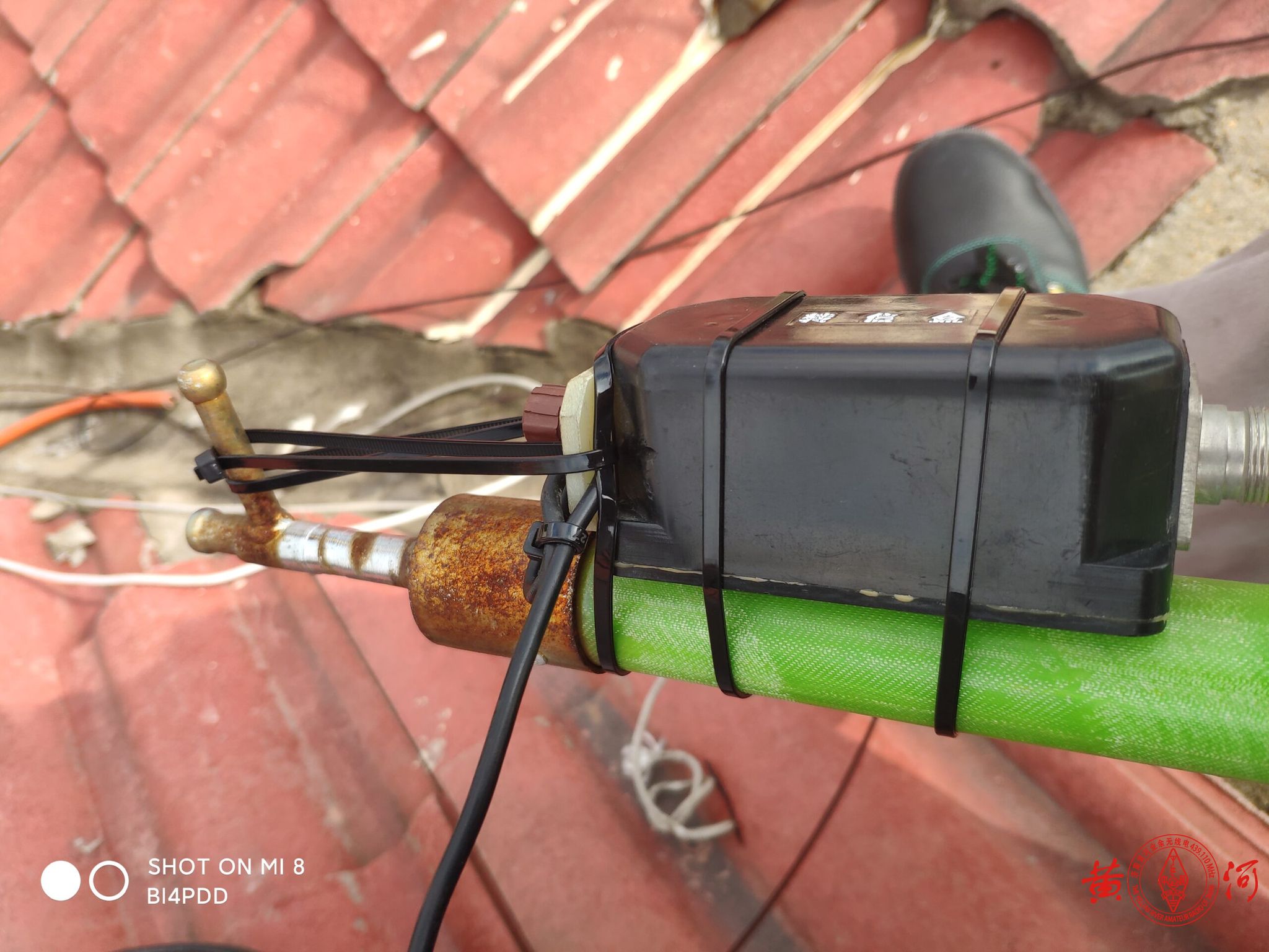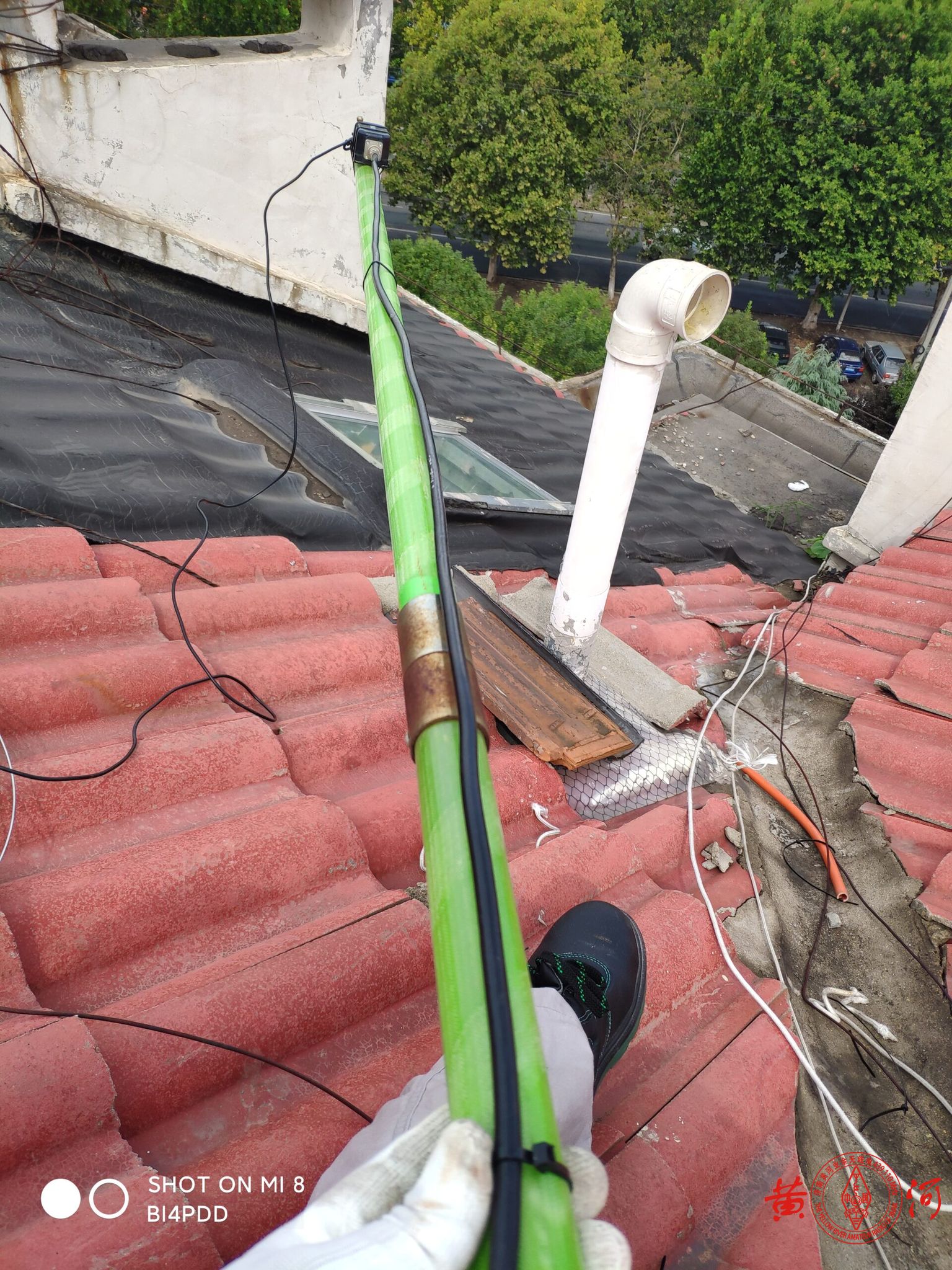 感慨完毕,开始干活。我所在的小区是老小区,坡顶,平时没什么人上来。故上次直接把撑杆扔在上面。我采用的支撑杆是4.5米的电气用零克棒,用扎带把巴伦固定在顶端,并把尼龙绳一起拴好,在这里我提醒下大家,风绳一定要提前系好,别等到架起来固定好了发现风绳扣高高在上,那就傻眼了。