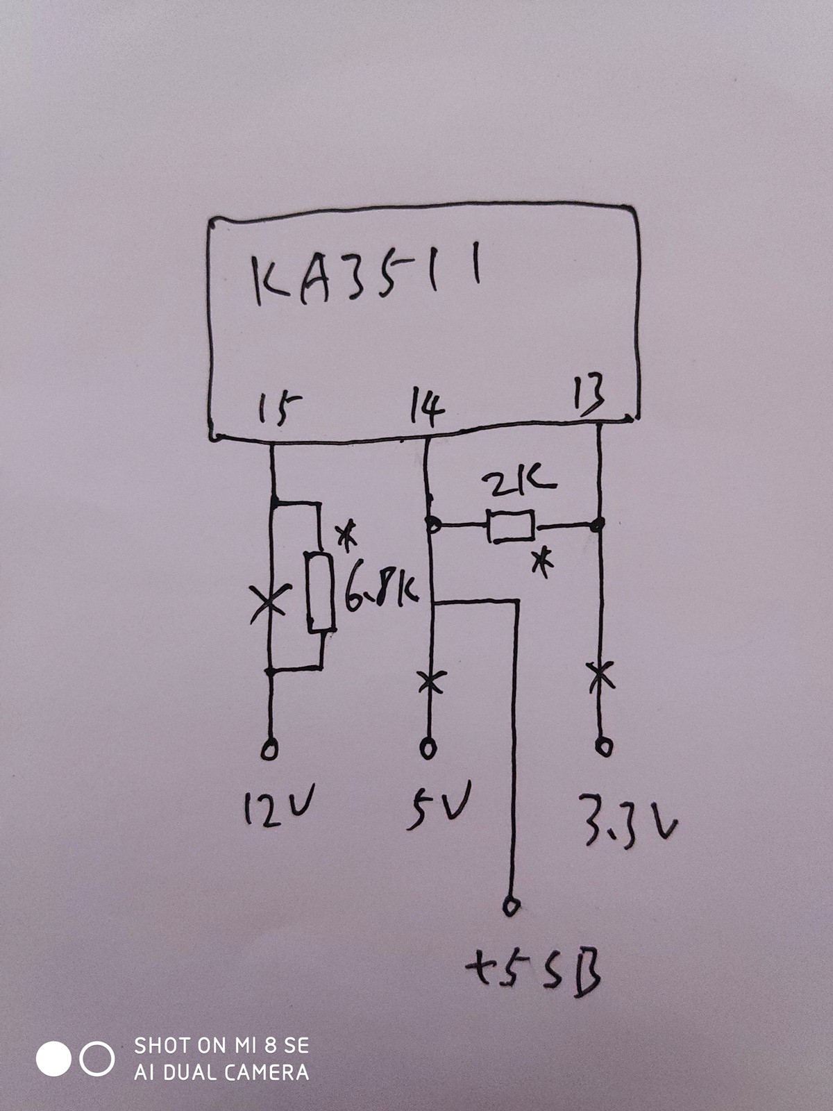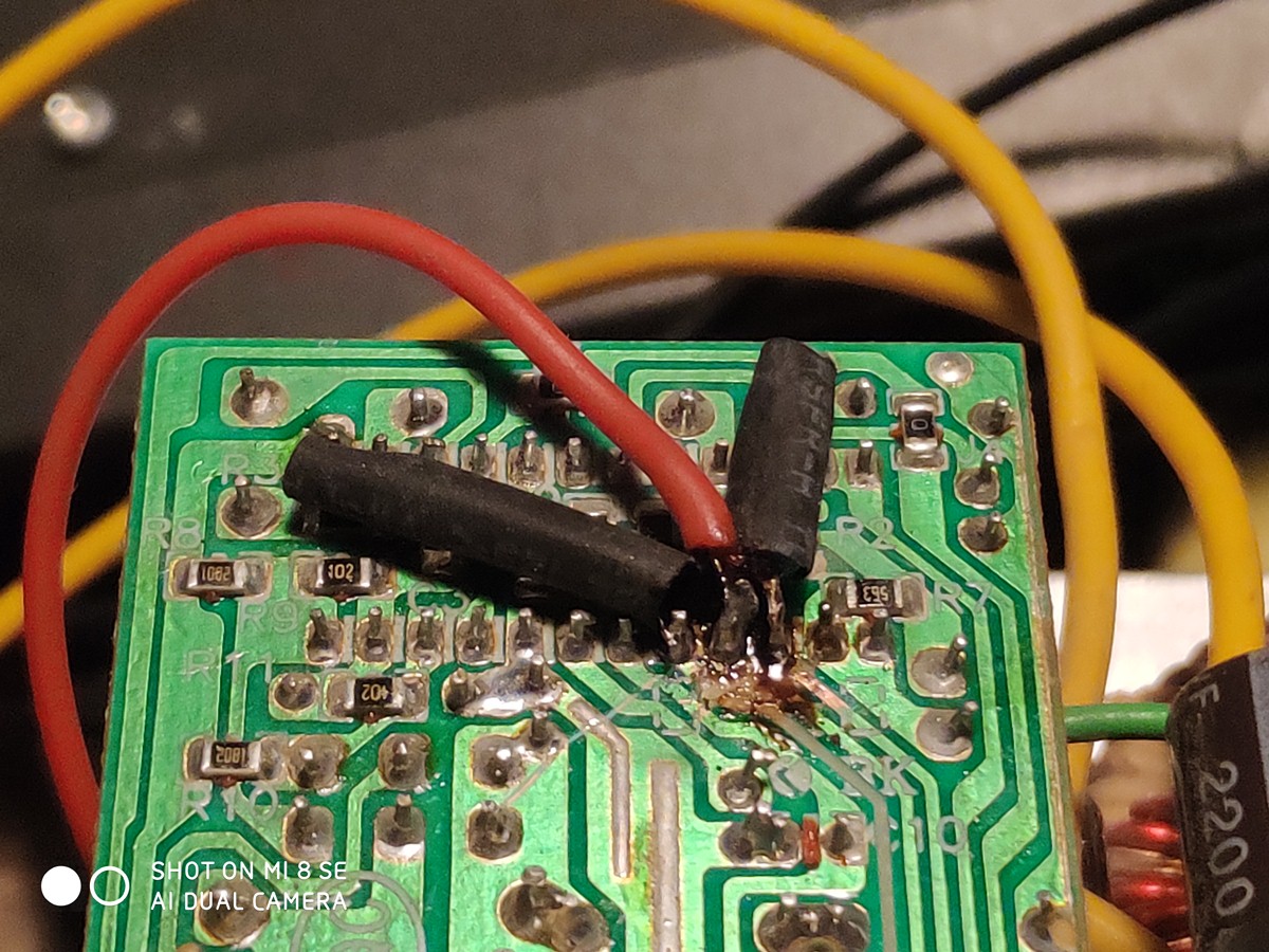 各位HAM朋友多数都会用一只车台,放在家里作为基地台使用,这时车台的电源就成了个不大不小的问题,因为多数电源输出为12V,而车台最大功率输出时,所需要的电压为13.8V,而且车台所需的电流比较大,甚至达到10A以上,就需要输出电流比较大的电源,购买满足要求的电源,是个不大不小的花费。大家的家里,多数都有些过时的电脑,而里面的台式机电源12V输出可达15A左右,能满足车台使用,但有两个小问题。一个是如何启动台式机电源,这个比较好解决,只要将插头上的绿色线与黑色地线短路,就可以启动电源,另一个就是台式机电源输出为12V,无法让车台输出最大功率。台式机电源为了运行的安全,有着完备的保护电路,不能简单的改动电压取样电阻来改变输出电压。虽然改造有难度,但肯定不是不能改,于是找了只台式机电源来,尝试改12V输出为13.8V当做车台电源使用。我找到的这只电源,控制IC为KA3511,网上搜索了一下,找到了参考图纸,虽然电路不完全相同,但作为参考,修改电路已经足够了。查KA3511资料,要想改变输出电压,需要改变第4脚所接的取样电阻数值,同时需要欺骗电压保护电路,让保护电路不会动作。KA3511电压保护共有三个输入端,分别是13/14/15脚,对应于3.3V、5V、12V的电压过压欠压保护,要想让保护电路不会动作,就要给这三个引脚提供正确的电压。取样电路的改造很简单,原取样电路下端电阻和微调电阻为一只1.8K电阻和串联的一只1K微调电阻,全部拆掉用一只2K的微调电阻代替。电压保护部分的改造是将KA3511第 13/14/15脚与原电路断开 ,第14脚改接到+5V SB端,因为+5V SB辅助电源电压是由单独电路稳定的,不会随主电路电压改变而改变,所以可以作为+5V的替代电压,13脚与14脚间接一只2K电阻,以供给13脚3.3V的替代电压,而15脚与原12V间断开后串接一只6.8K电阻,就可以在输出为13.8V时,提供一个12V的替代电压给15脚。改造中为了使用方便,拆除了大部分输出引线,只保留了四根黑色的地线和四根黄色的+12V输出线,同时直接将绿色线焊接在GND上,让电源上电即可正常运行。电路改造完成后,就可以开机调整输出电压了,注意取样电路2K微调电阻在上电前一定要将阻值调整为最大,然后再上电开机,开机后调整2K微调电阻让输出电压为13.8V,注意调整微调电阻时一定要慢,不要让输出电压过高,造成电源损坏。改造后电源空载输出电压为13.8V,带载13.14V,大电流输出时12.9V,测试我拼装的的车台,输出竟然超过了25W达到了29W,经通联测试,语音信号清晰良好,无电流声或谐波干扰声,至此电源改造宣告成功。