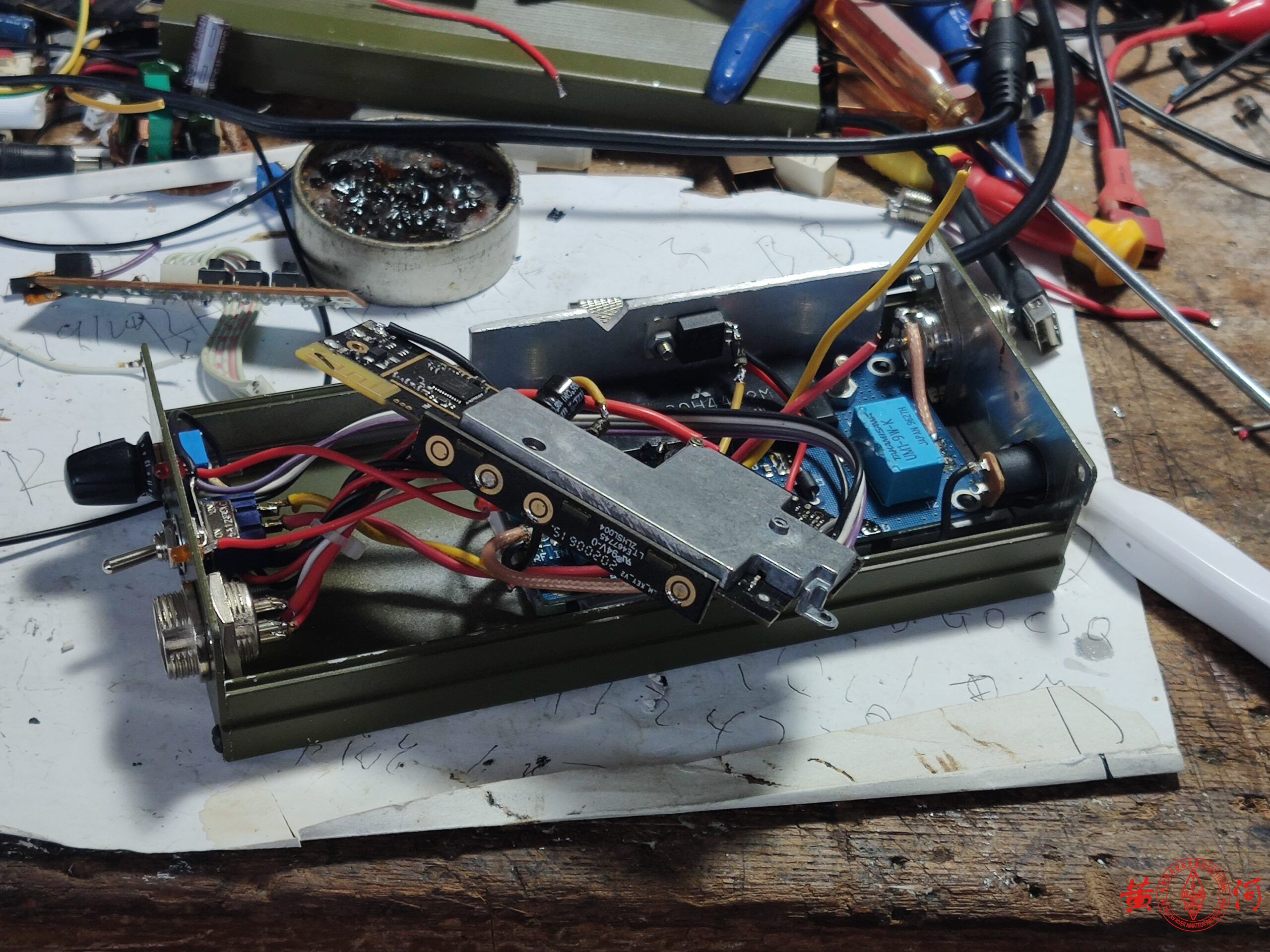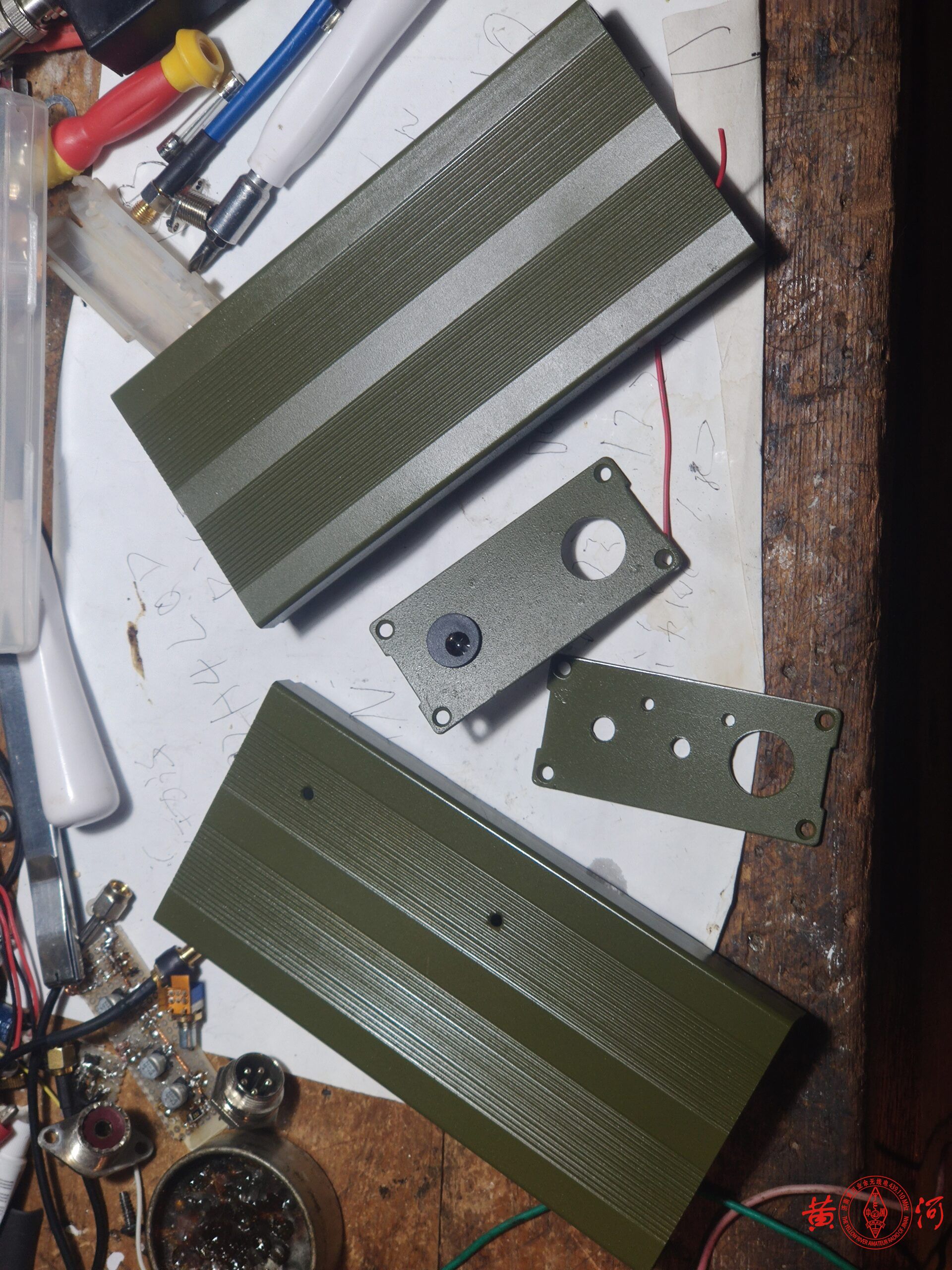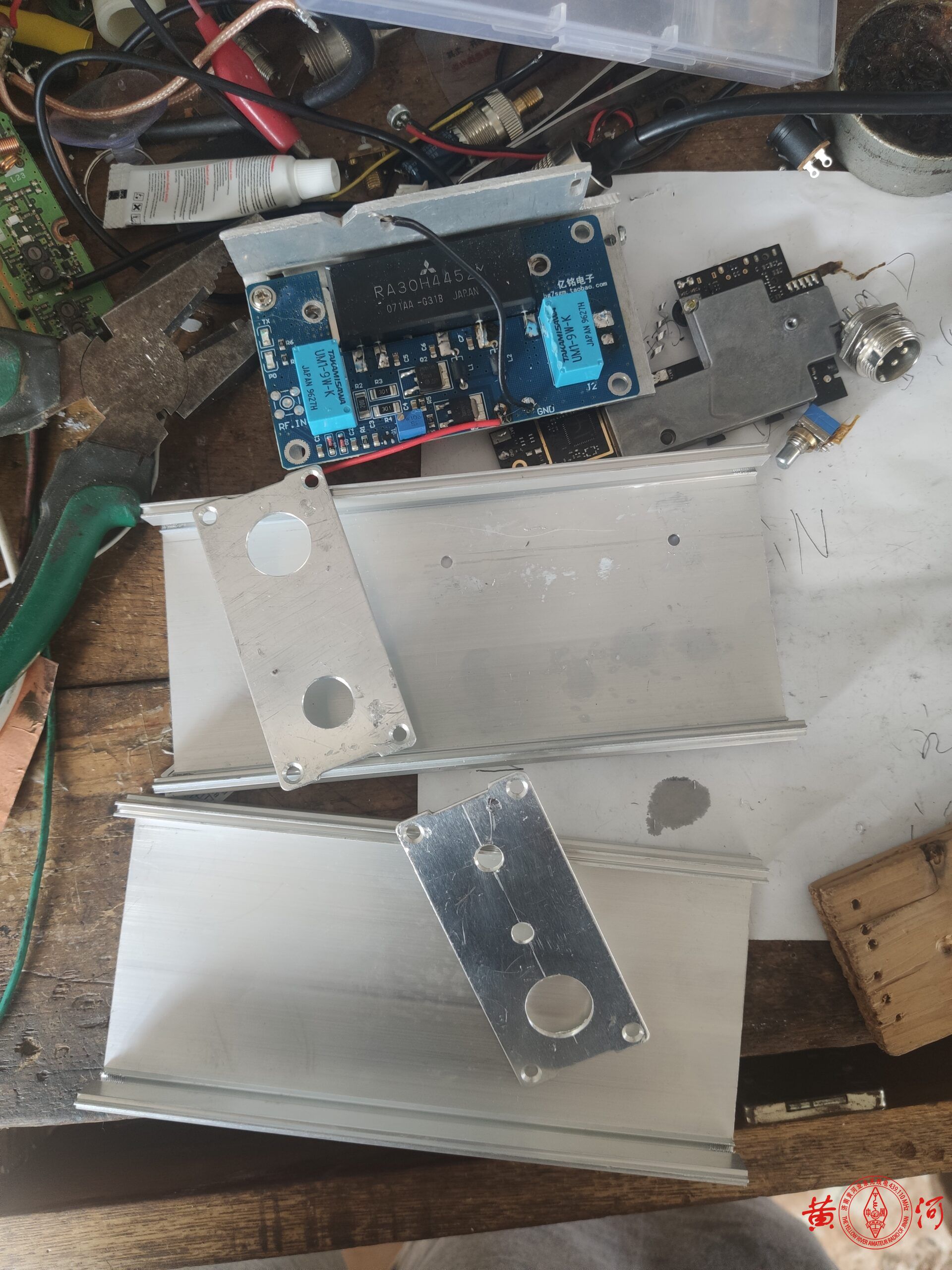 不过小米1青春版手台虽然在HAM眼里几乎一无是处,但有一个重要的好处就是可以手机蓝牙置频,接上一只25W的射频功放,就成了一只基地台。花65块买了只旧小米1青春版手台,拆出机芯,上网买了只便宜的建伍868G车台,拆出功放模块,本想自己做收发转换电路,看了看淘宝有卖成品板的,于是定了只成品板,懒就一个字,没办法。有成品板,制作就简单了,找只合适的外壳,把射频功放部分装上,加了一块2MM厚铝板,不是为了帮助散热,是为了帮助吸热,增加壳体的热容量,毕竟我选的外壳比较小,完全依赖壳体散热,会散热不足,加散热片风扇又会增加体积,于是加块铝板增加热容量,让温度上升的慢一点,等温度升起来,早就通联完了。小米手台用一只7805串接2只镇流器里拆出的IN4007二极管降压供电,手咪接口用了一只五针的航空插头,原先这个航空插头要同时负责写频,这次不用了,装机过程非常顺利,有成品板什么都好办了。小米手台的频道选择旋钮、开机键、音量键都接出来,装到面板上,指示灯也是,试机很顺利,发射正常。但后来接上我的9单元八木,收发转换电路总是误动作,分析原因,应该是9单元八木天线接收到的杂散信号过强,让收发转换电路产生了误动作,办法很简单,在收发转换电路的三极管基极上对地接上一只10K电阻增加抗干扰能力,再次试机,OK了。至此,以后就用这只拼装的基地台与大家通联了,破电台有扰各位雅听,还请见谅。