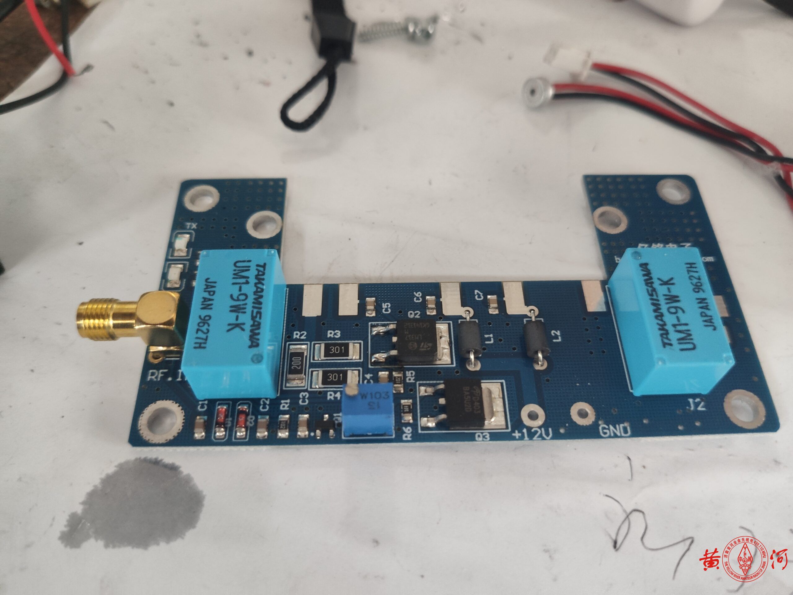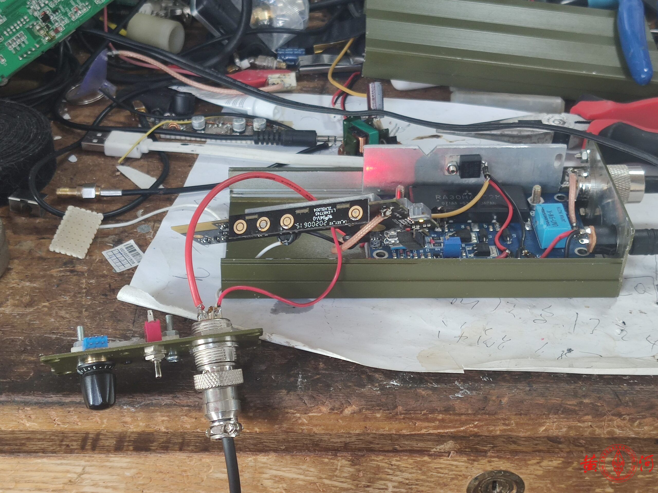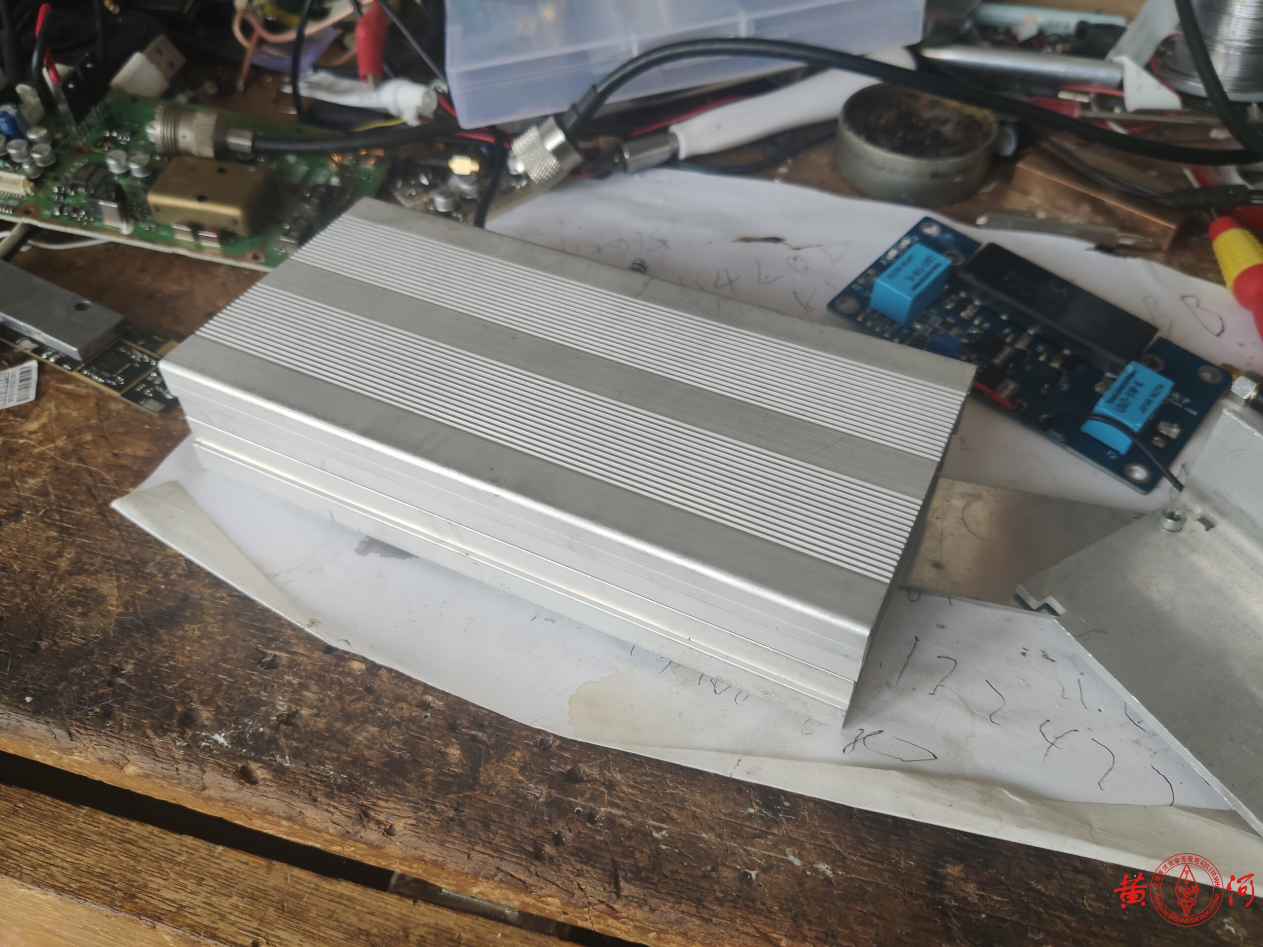 不过小米1青春版手台虽然在HAM眼里几乎一无是处,但有一个重要的好处就是可以手机蓝牙置频,接上一只25W的射频功放,就成了一只基地台。花65块买了只旧小米1青春版手台,拆出机芯,上网买了只便宜的建伍868G车台,拆出功放模块,本想自己做收发转换电路,看了看淘宝有卖成品板的,于是定了只成品板,懒就一个字,没办法。有成品板,制作就简单了,找只合适的外壳,把射频功放部分装上,加了一块2MM厚铝板,不是为了帮助散热,是为了帮助吸热,增加壳体的热容量,毕竟我选的外壳比较小,完全依赖壳体散热,会散热不足,加散热片风扇又会增加体积,于是加块铝板增加热容量,让温度上升的慢一点,等温度升起来,早就通联完了。小米手台用一只7805串接2只镇流器里拆出的IN4007二极管降压供电,手咪接口用了一只五针的航空插头,原先这个航空插头要同时负责写频,这次不用了,装机过程非常顺利,有成品板什么都好办了。小米手台的频道选择旋钮、开机键、音量键都接出来,装到面板上,指示灯也是,试机很顺利,发射正常。但后来接上我的9单元八木,收发转换电路总是误动作,分析原因,应该是9单元八木天线接收到的杂散信号过强,让收发转换电路产生了误动作,办法很简单,在收发转换电路的三极管基极上对地接上一只10K电阻增加抗干扰能力,再次试机,OK了。至此,以后就用这只拼装的基地台与大家通联了,破电台有扰各位雅听,还请见谅。