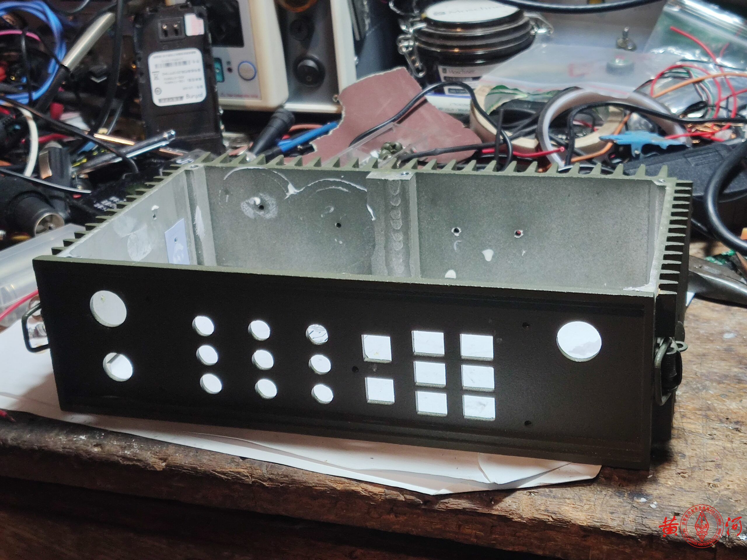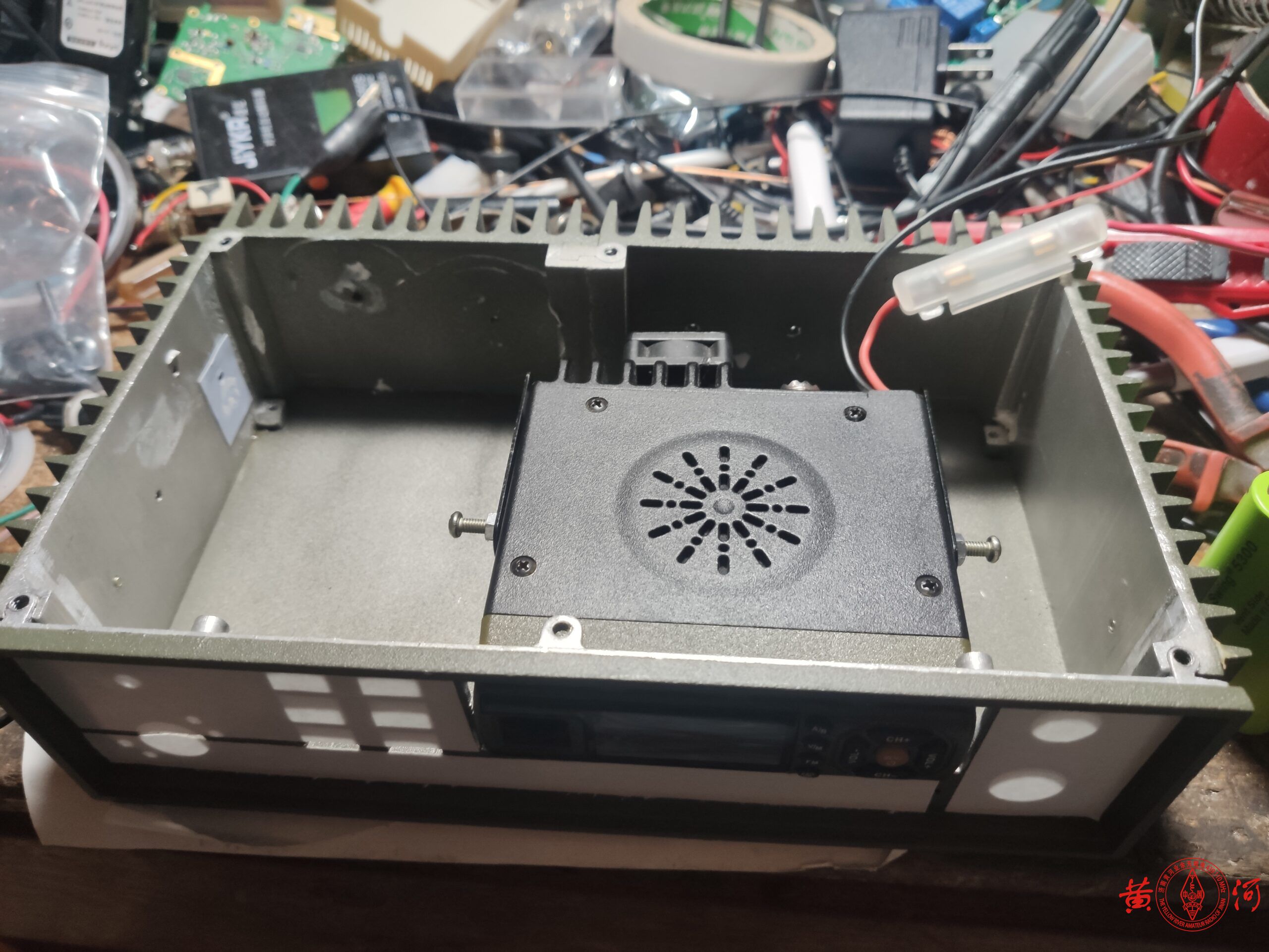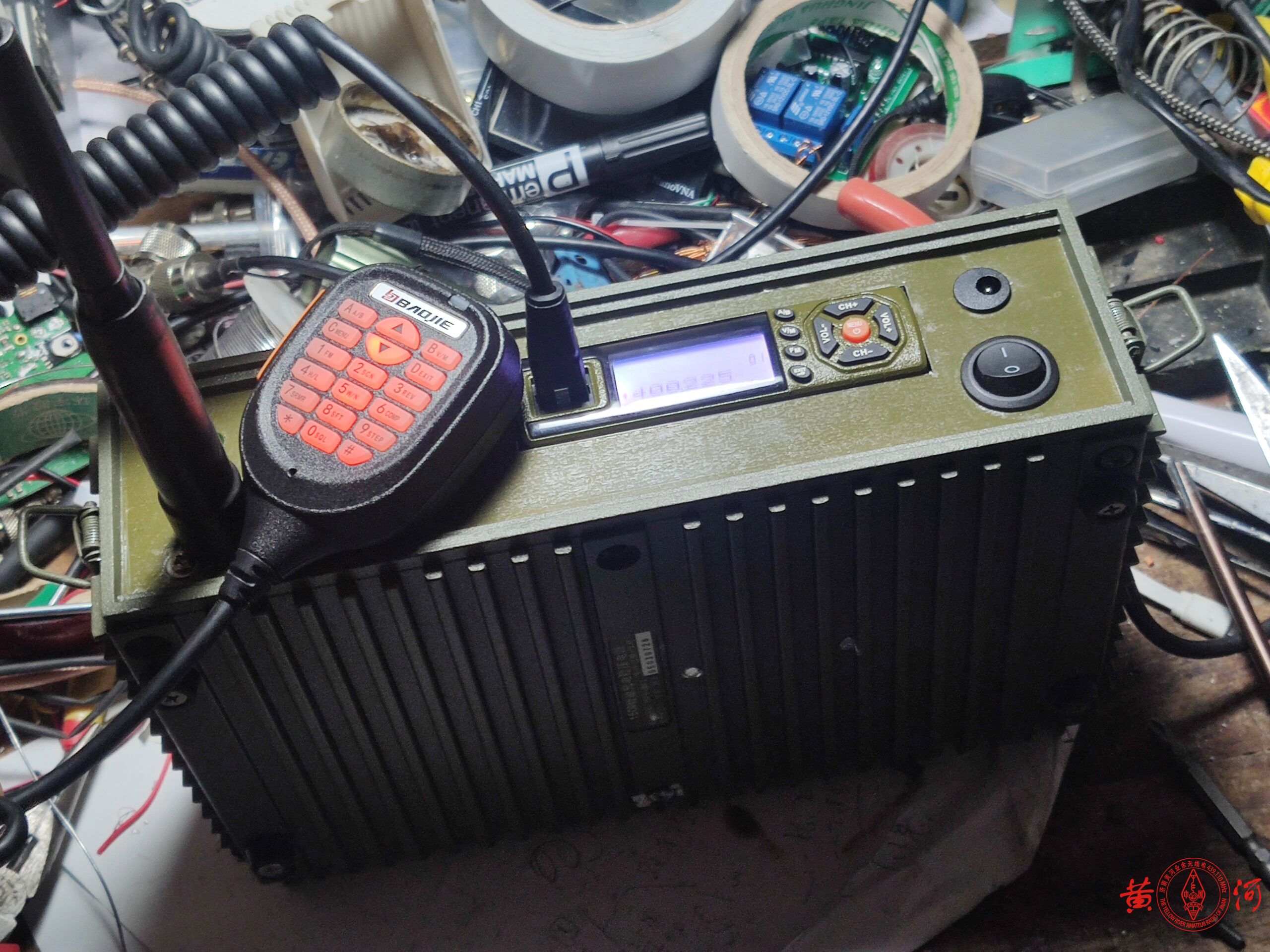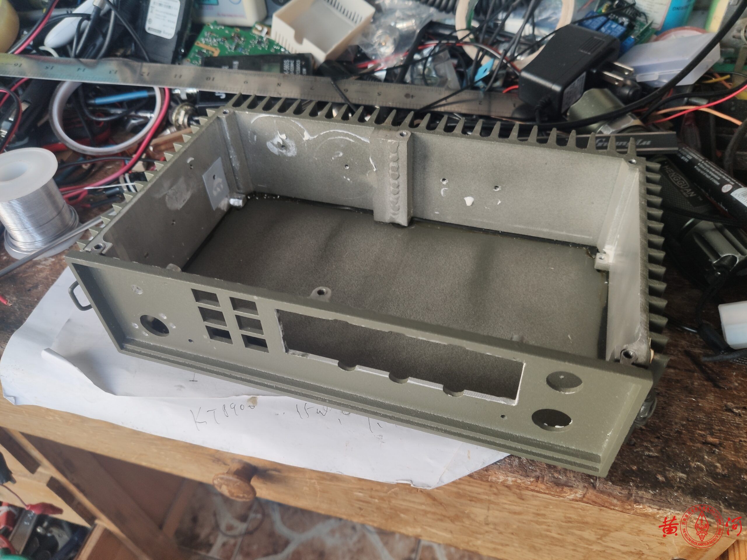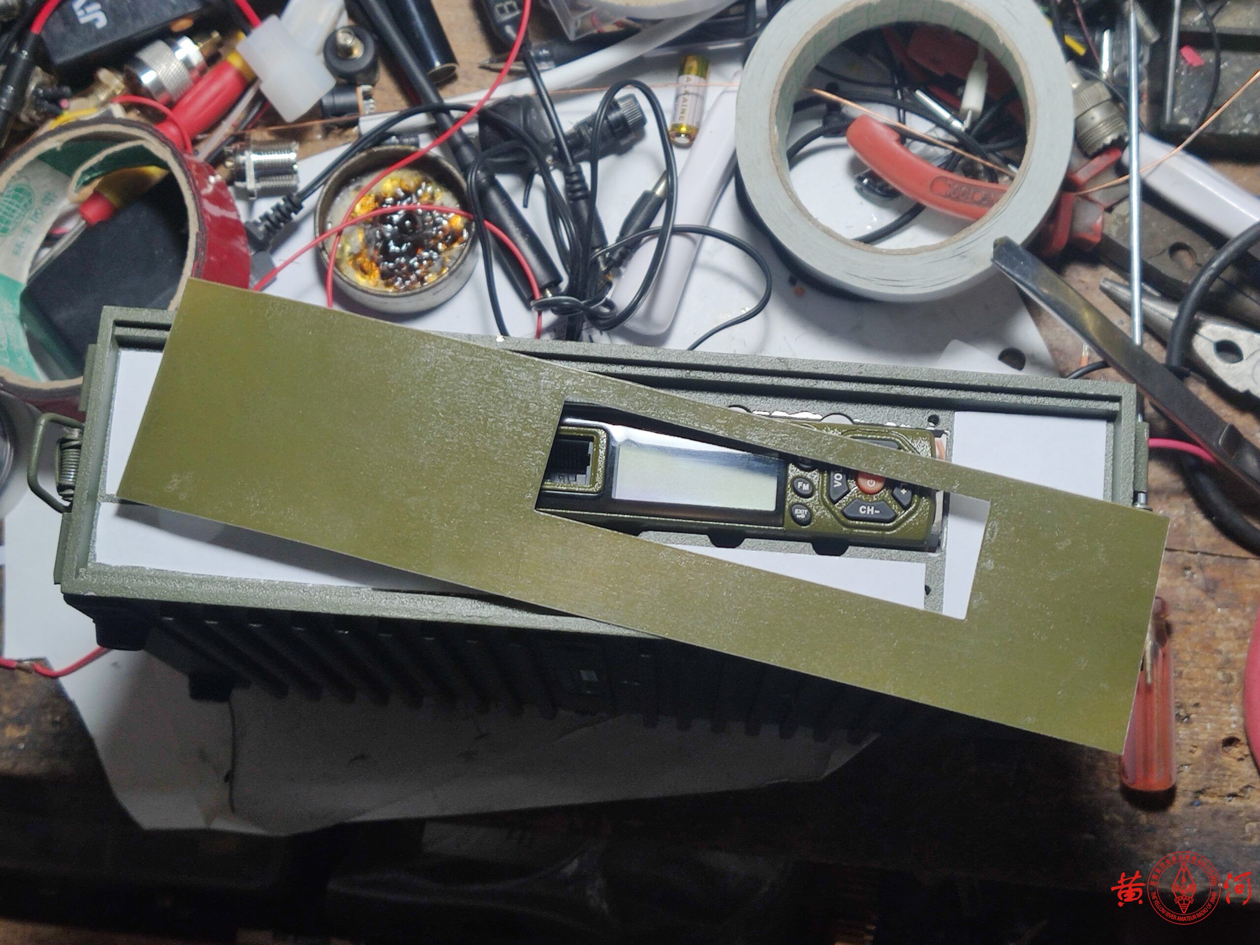 闲鱼看到一台军用电台的充电机,外壳尺寸非常适合改造背负台使用,于是下定单买来。到货后,拍留念照,拆机,军用机就是结实,铝壳体非常厚实,用料真是不计工本。为了改造背负台,又找到一只宝捷218车载电台,主要好处是体积比较小,方便改造,另一个功率不是太大,因为背负台经常天线直接安装在电台上使用,距离人体非常近,虽然我属于认为不会掉头发的哪一派,但这么靠近人体,还是要控制下电台功率较好。拆机后,将原面板打开一个大小适当的开口安放宝捷218车台面板,然后将宝捷218车台的面板拆下,改喷军绿色喷漆,又重新制作了绿色的面板,电池用了3.7V锂电3节串联,容量5AH,足够使用了。面板上比较简洁,只放置了电源开关、电源指示灯、充电插口、天线接口。背负台改造中很容易碰到的一个问题就是射频干扰,因为背负台天线距离电台面板非常近,射频信号进入手咪线或面板电路后会造成电台死机、关机或者话筒没有声音,所以一定要采取一定的屏蔽措施,或者换用抗干扰性强的手咪,对于电台的选择也很重要,一定要选择性能较好,抗干扰性强的电台。这次改装主要困难就是射频干扰的消除,不过最终终于通过屏蔽及各种接地措施解决了,经过测试,使用效果良好,在章丘财经大学院内,二楼高度,室内发射,可以通联到黄河中继,信号49无断续,室外地面高度通联黄河中继59,下面是改造过程。