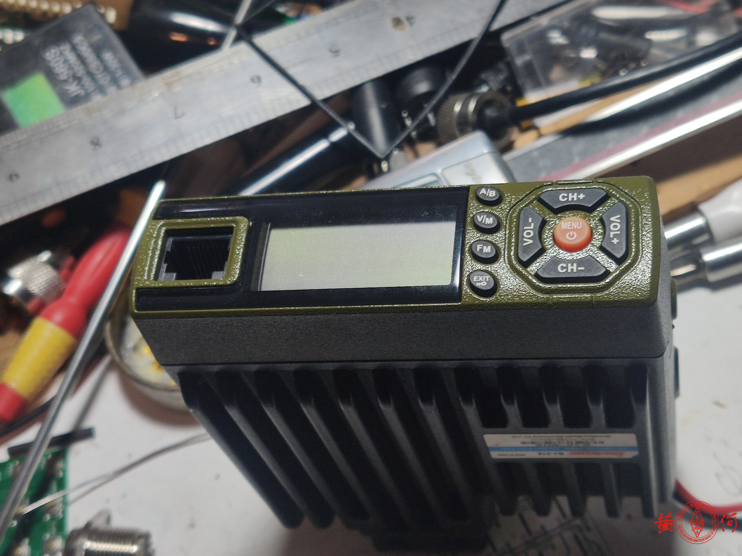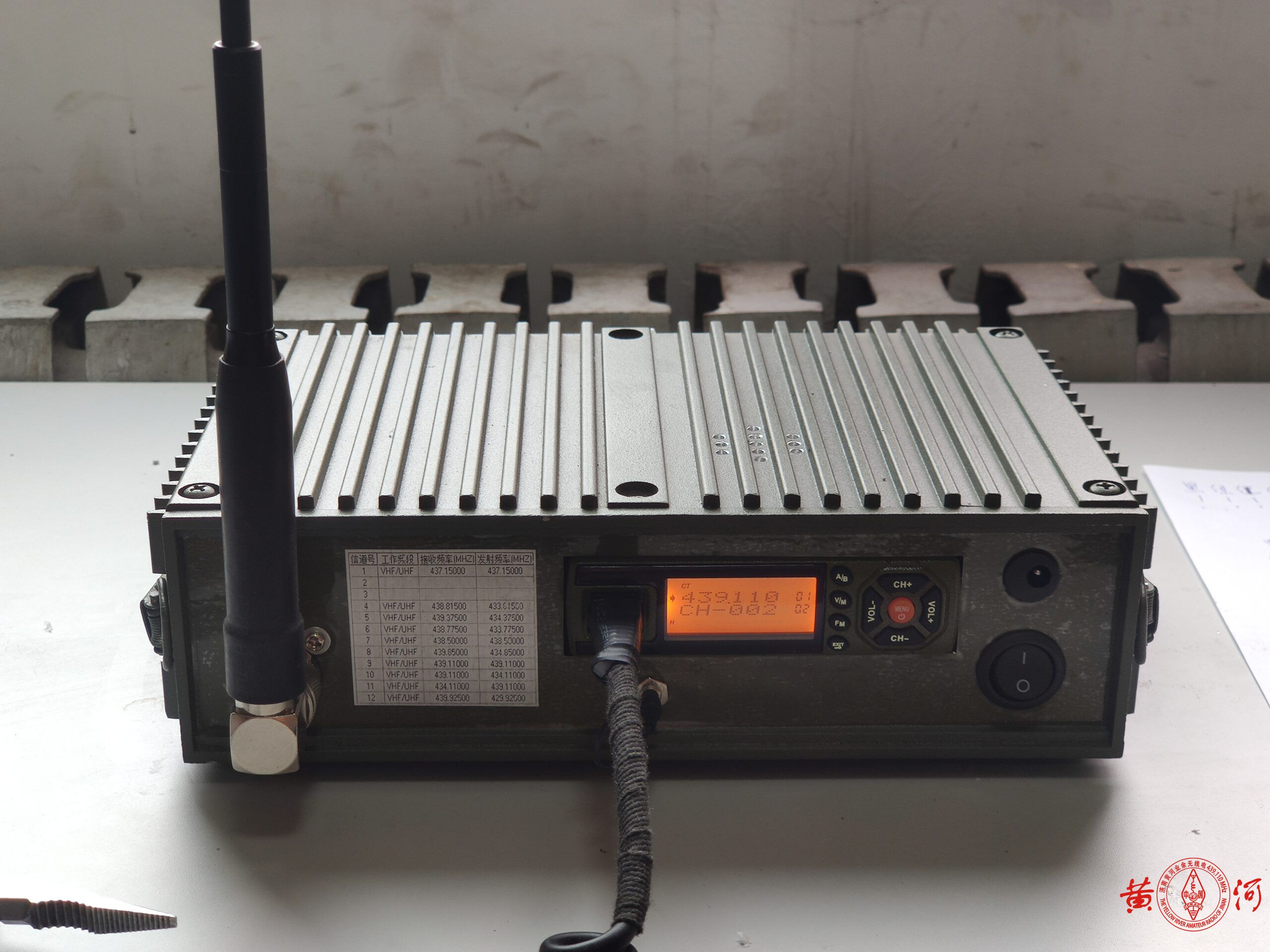 装好后的样子,天线用一只90度转接头安装在背负台上,也可以直接拧上天线,垂直使用,面板左边哪里比较空,于是打印了一张频率表贴上。
