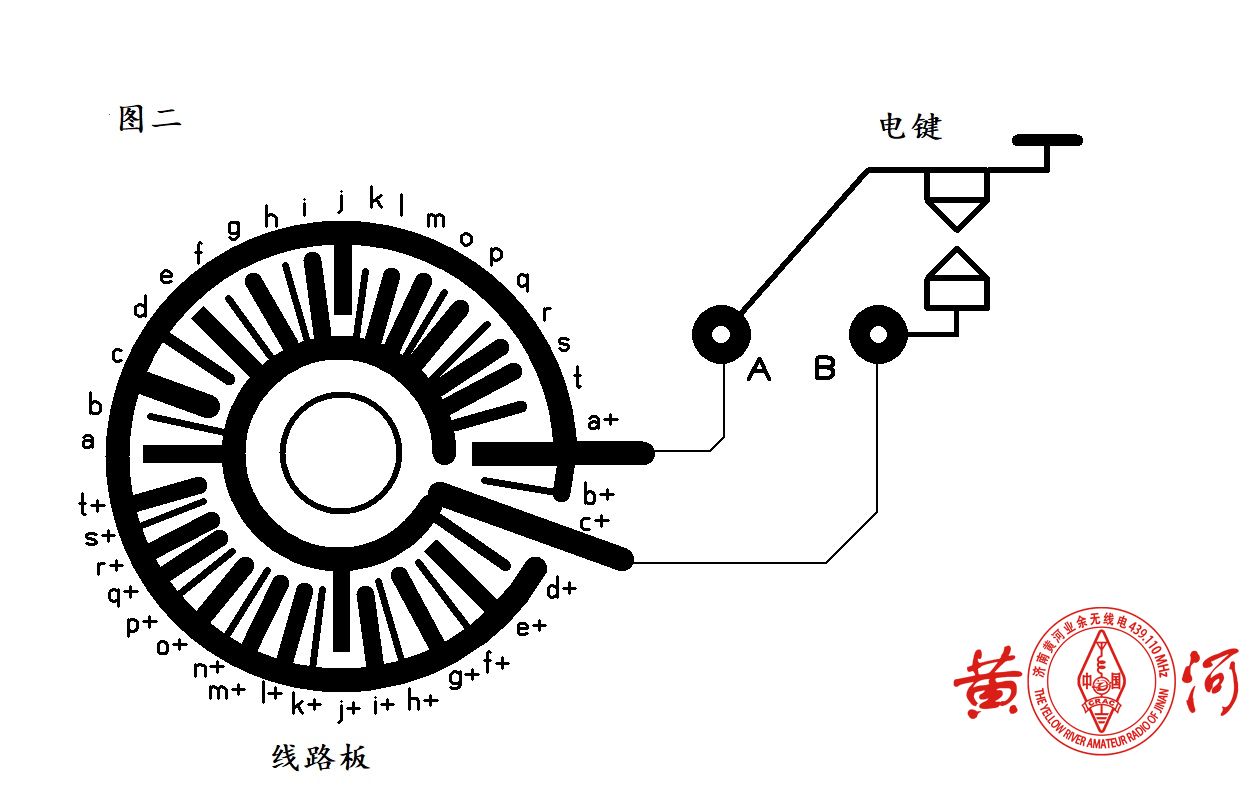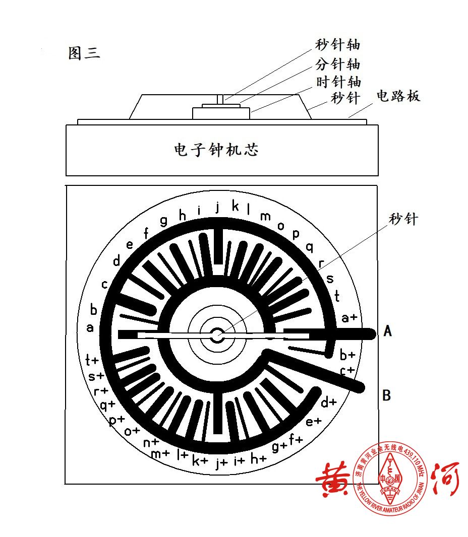 原理很简单:电子表机芯通电后,秒针顺时针旋转,因指针是金属的而且经过改制(后述),会短路印刷电路板上的某两个对称点,比如 a+/a、b+/b、c+/c 以此类推,等同于我们在按下电键,而当秒针运行到对应的两处空白处时,等同于松开电键,如此周而复始,达到发码目的。