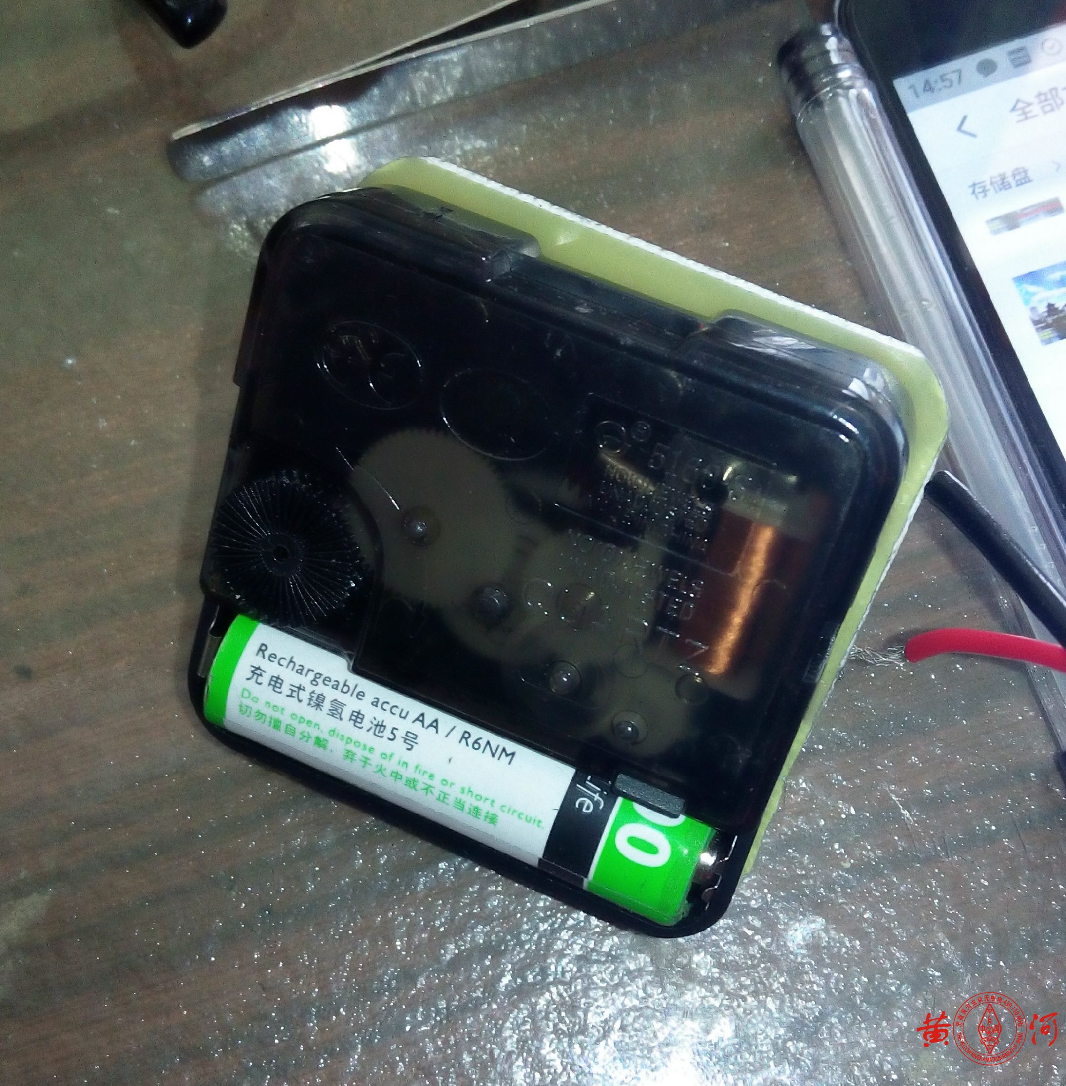 给机芯装上电池,观察秒针运行是否平稳,并用万用表欧姆档,两表笔分别接在A/B 两端,可见表针会断续摇摆即可。将A/B 接在发报机电键位置(电键保持常开),就可以使用了。打开你需要测试发射距离的发报机,接上本装置,你就可以手持能与你的发报机匹配的接收装置或者收音机即可进行测试。发码的节凑由线路板铜箔线的宽窄、间距而定。大家可以自己再琢磨改进。