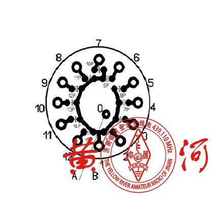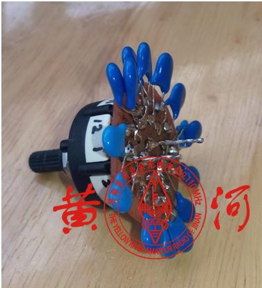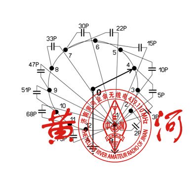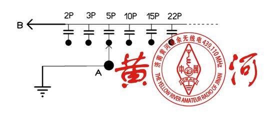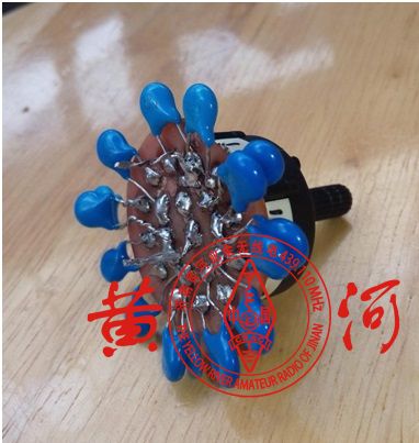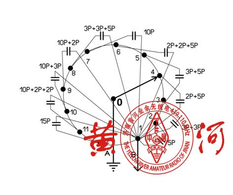3、按照图一所示,将瓷片电容按照升(降)序依次焊接在波段开关各接线端。电容也可通过串并联方式获得需要的容值。图中,波段开关的第1档作为公共端B,所有电容一端接此,相当于可变电容的定片,开关的“0”位(A) 相当于可变电容的动片。本例中可变电容容量可在2-75P 内步进可调。可调容量范围越窄,越接近线性;步进越小,调谐越细密。 图二 是电路;图三是5P-15P 步进为1P的短波微调;图四是单刀12档波段开关实物,图五是印刷电路供参考,图六-图八是20P/200P高压步进可变电容(电容均焊接在覆铜板面),图九是使用在电子管发报机里的实物。