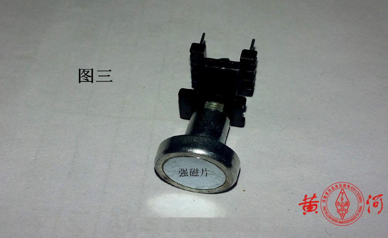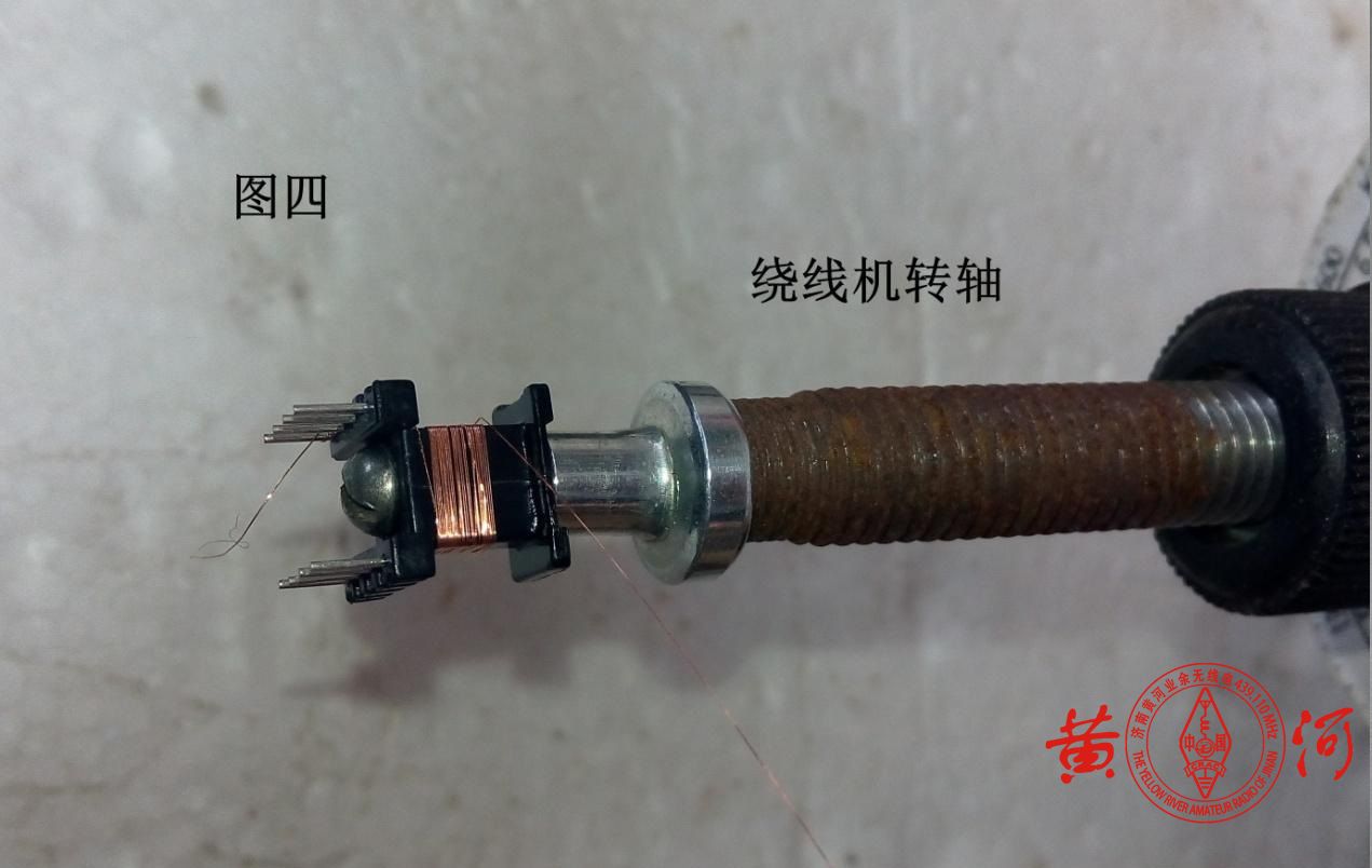 俗话说,情急生智。在我的杂物堆里找来了旧 LED 吸顶灯上拆下来的 一枚强磁螺帽和一枚 M3 的螺栓(图一);将螺栓从骨架针脚一头穿过线芯骨架,再与强磁螺帽旋紧(图二、图三);最后,将强磁螺帽的有磁性片的一面吸附在 绕线机转轴上,稍微调整一下中心就可以 开始绕线了(图四)。