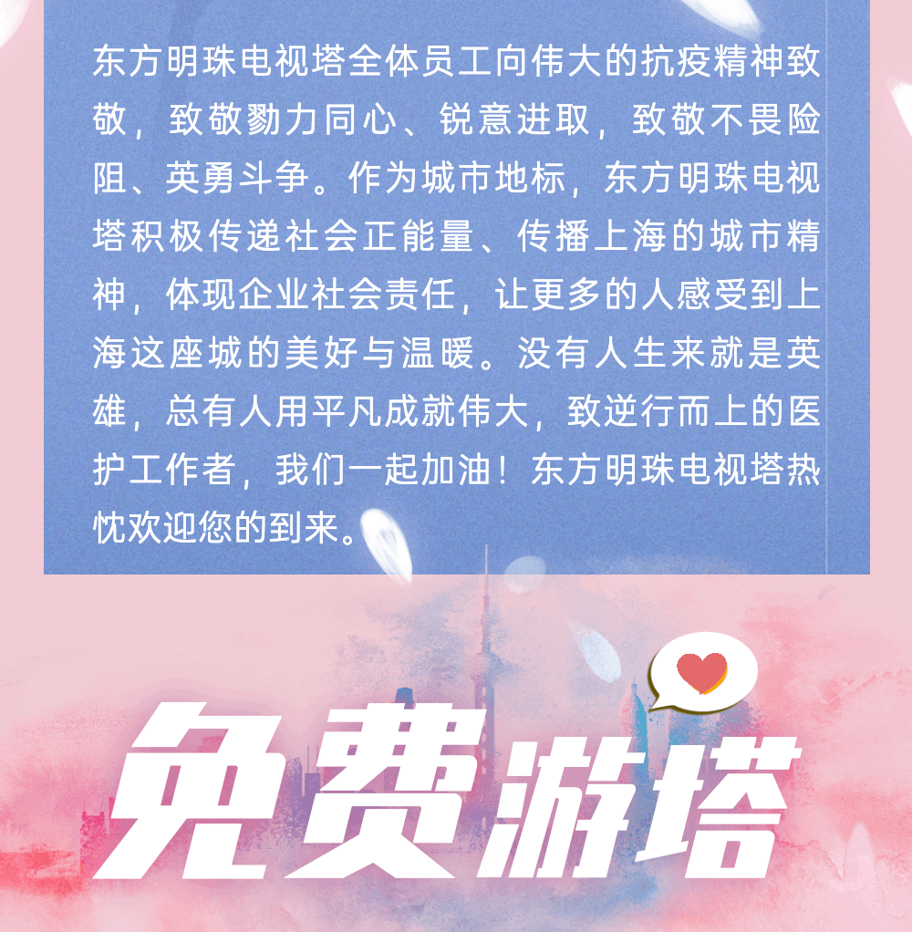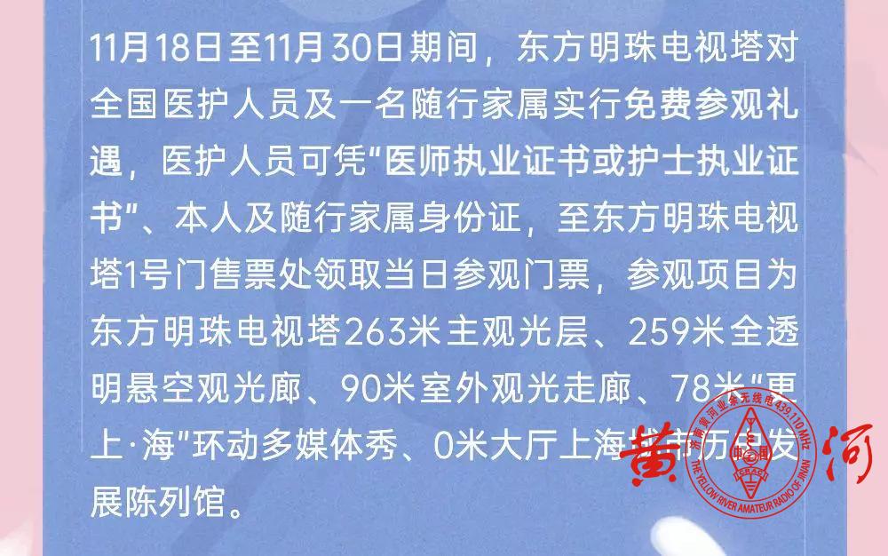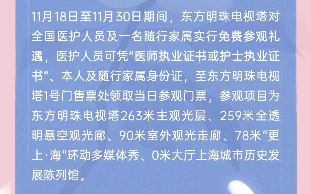 东方明珠为感谢全国医护人员的坚守奉献,11月18日-11月30日之前所有医护人员可以带1名家属免费参观