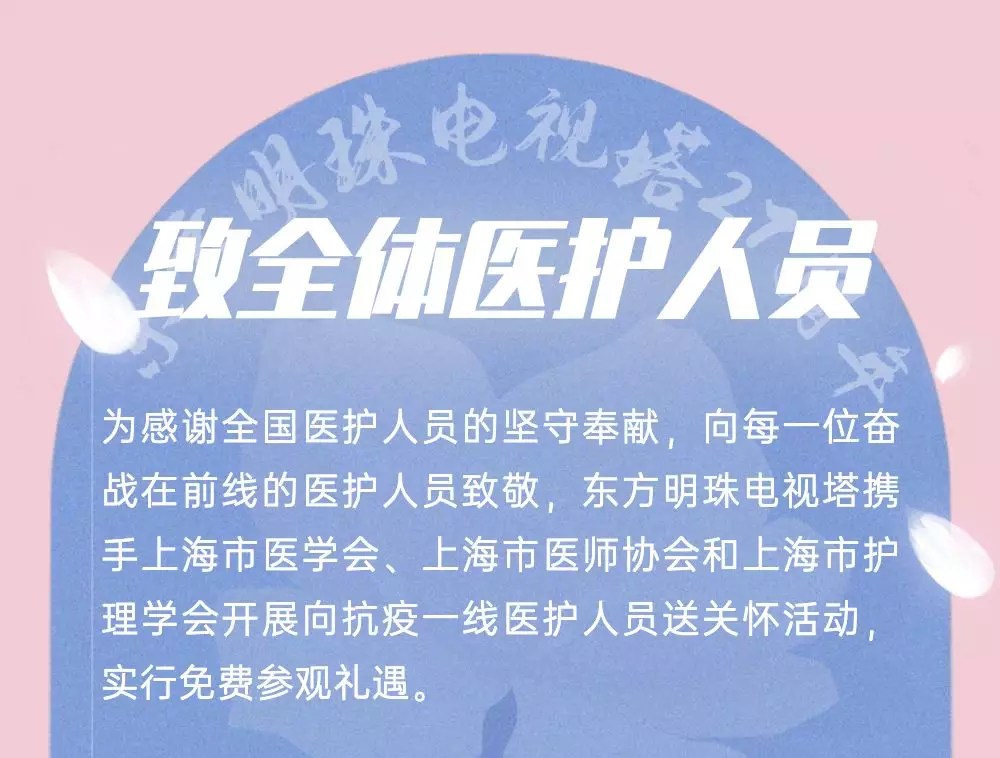 医护人员可凭“医师执业证书或护士执业证书”本人及随行家属身份证,至东方明珠电视塔1号门票售票处领取参观门票。