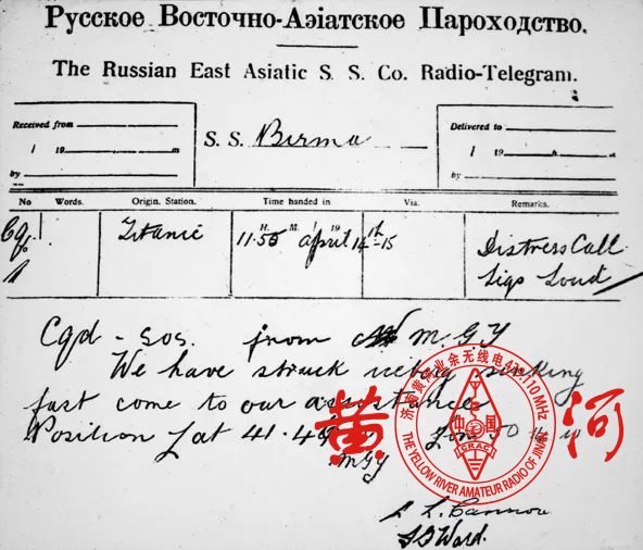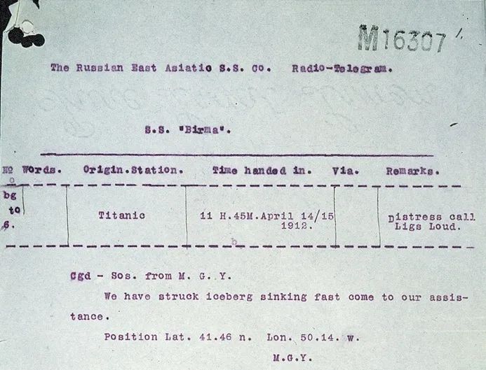 “CQD SOS 11.50pm from MGY。我们撞到了冰山,正在快速下沉,位置为 N41.46 W50.14。”