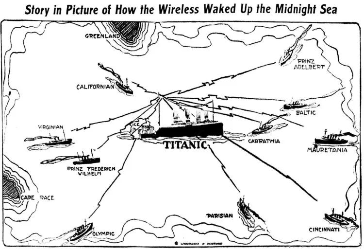 泰坦尼克号与其他船只的无线电通信示意图丨clickamericana.com