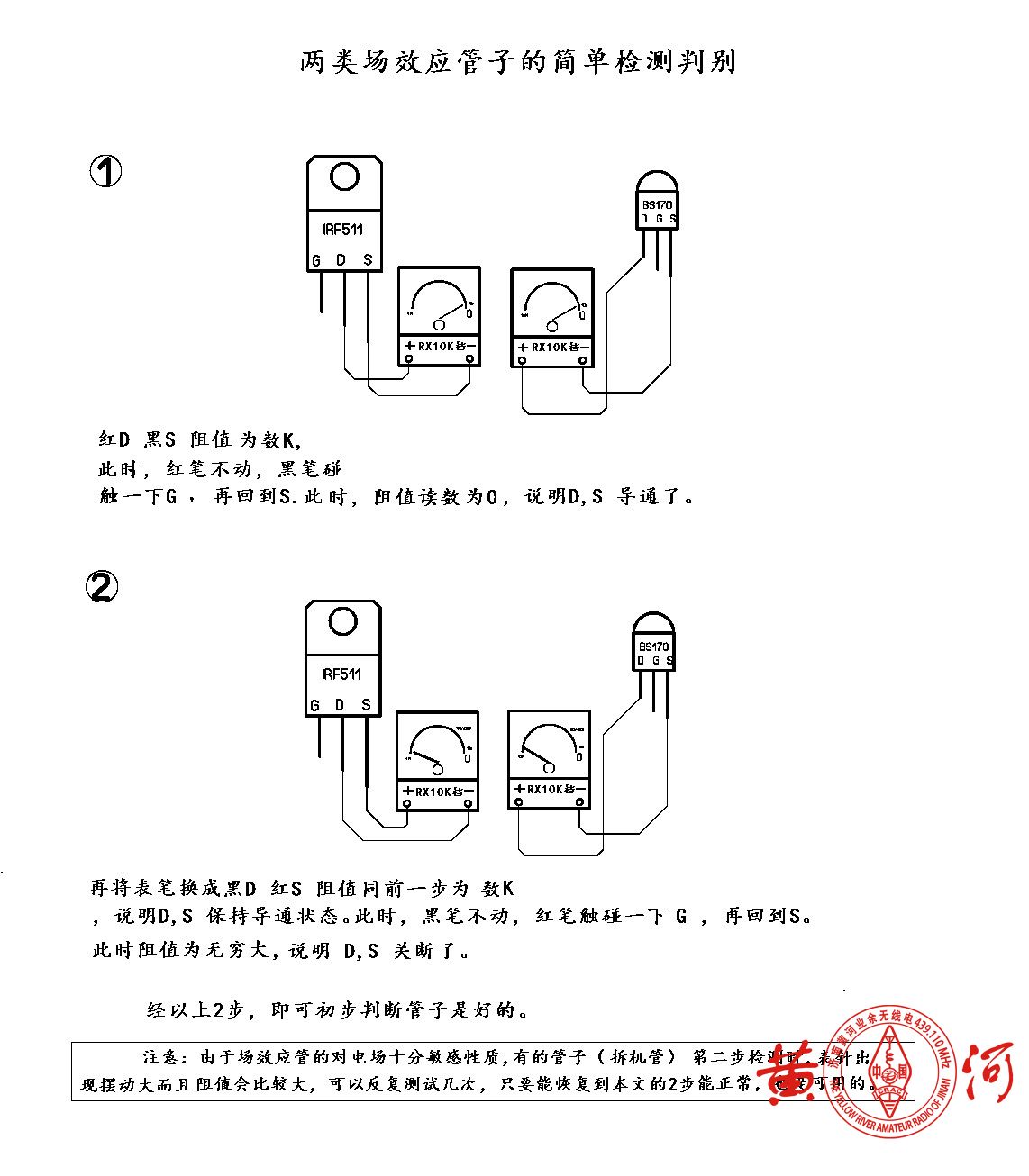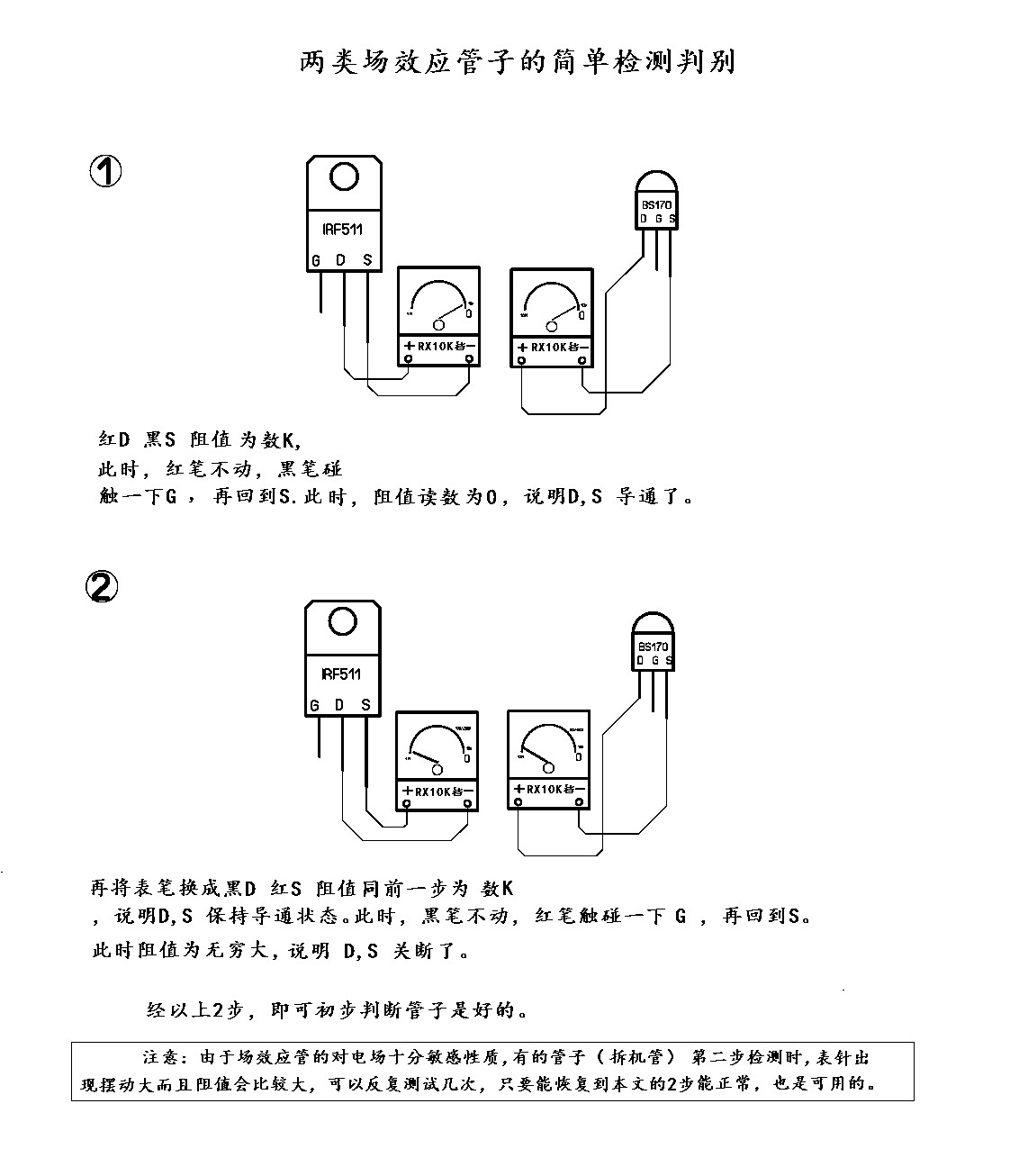 黑D 红S,阻值同上一步,为数0,说明D,S保持导通状态。