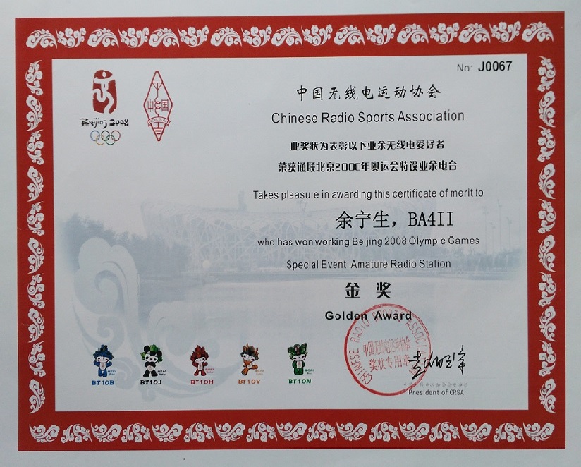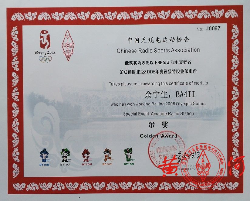 这是我参加北京奥运特设台通联比赛获得金奖。