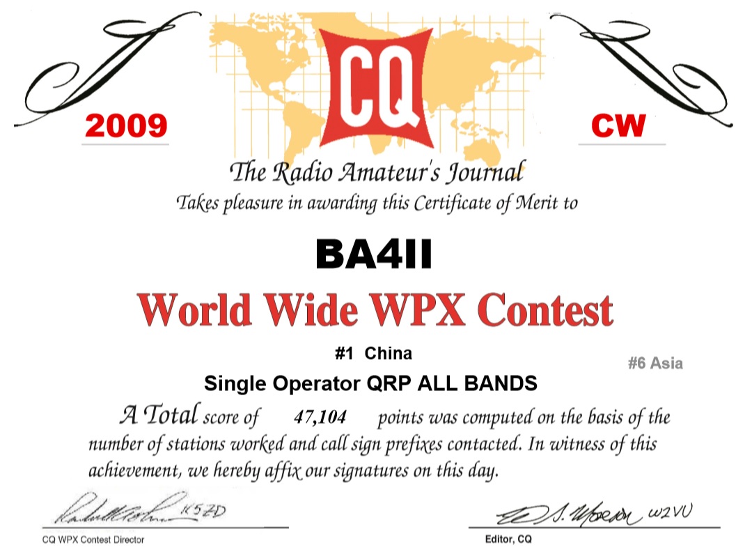这是2009年参加国际CQWW-WPX比赛,我参加QRP组,获得中国第一的成绩。