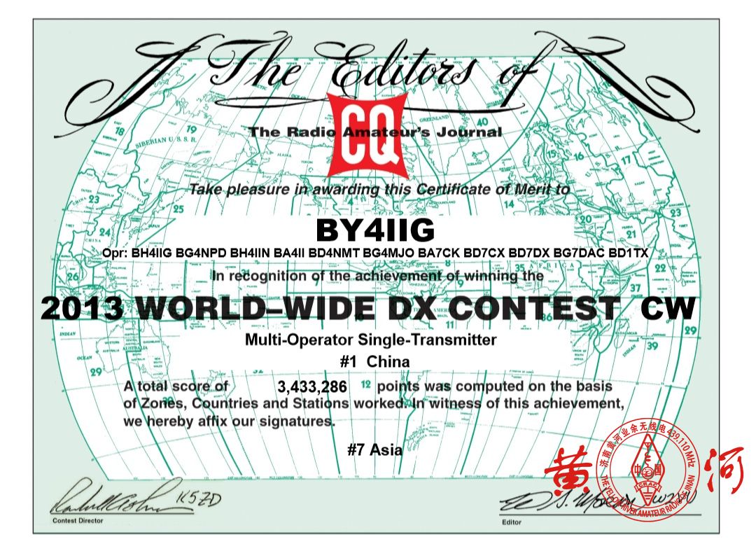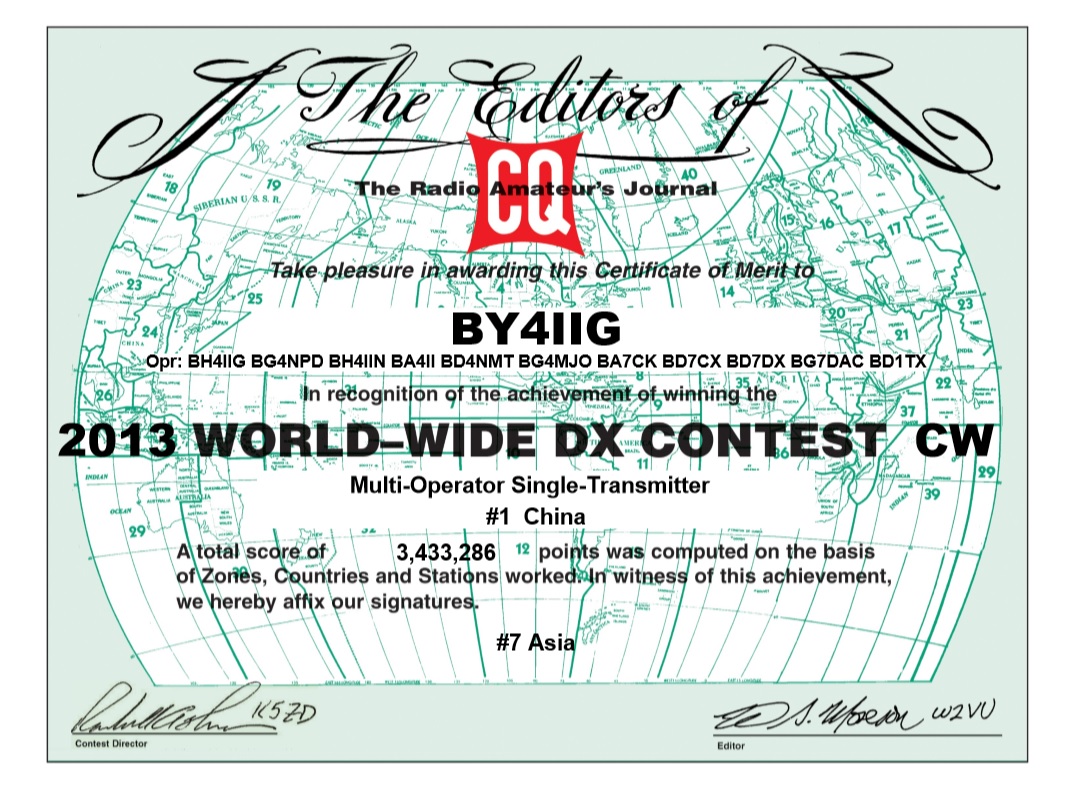 这是我在淄博电台村BY4IIG集体台,参加2013年CQWW-CW比赛,获得中国第一的成绩。