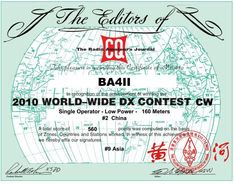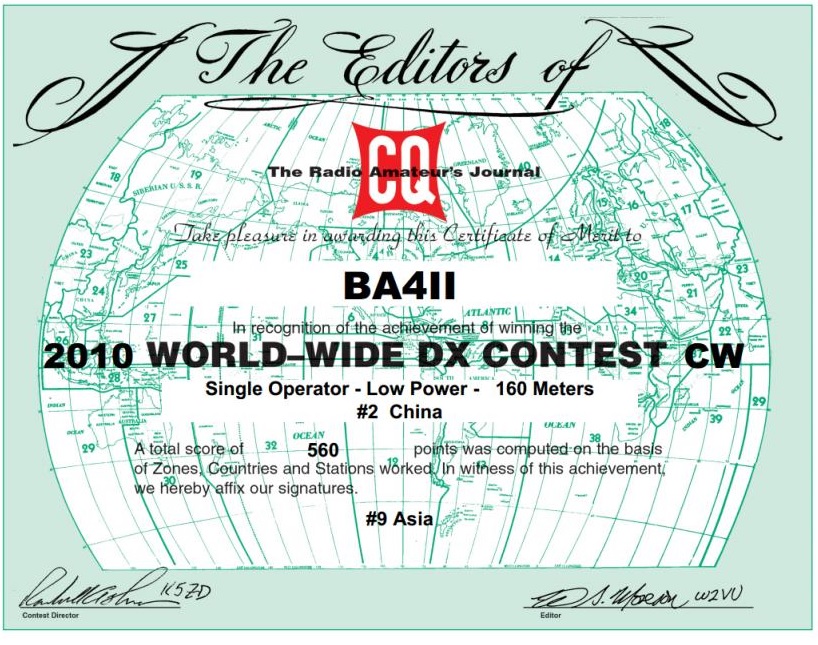 这是我参加国际2010年CQWW-CW,160米段的奖状。