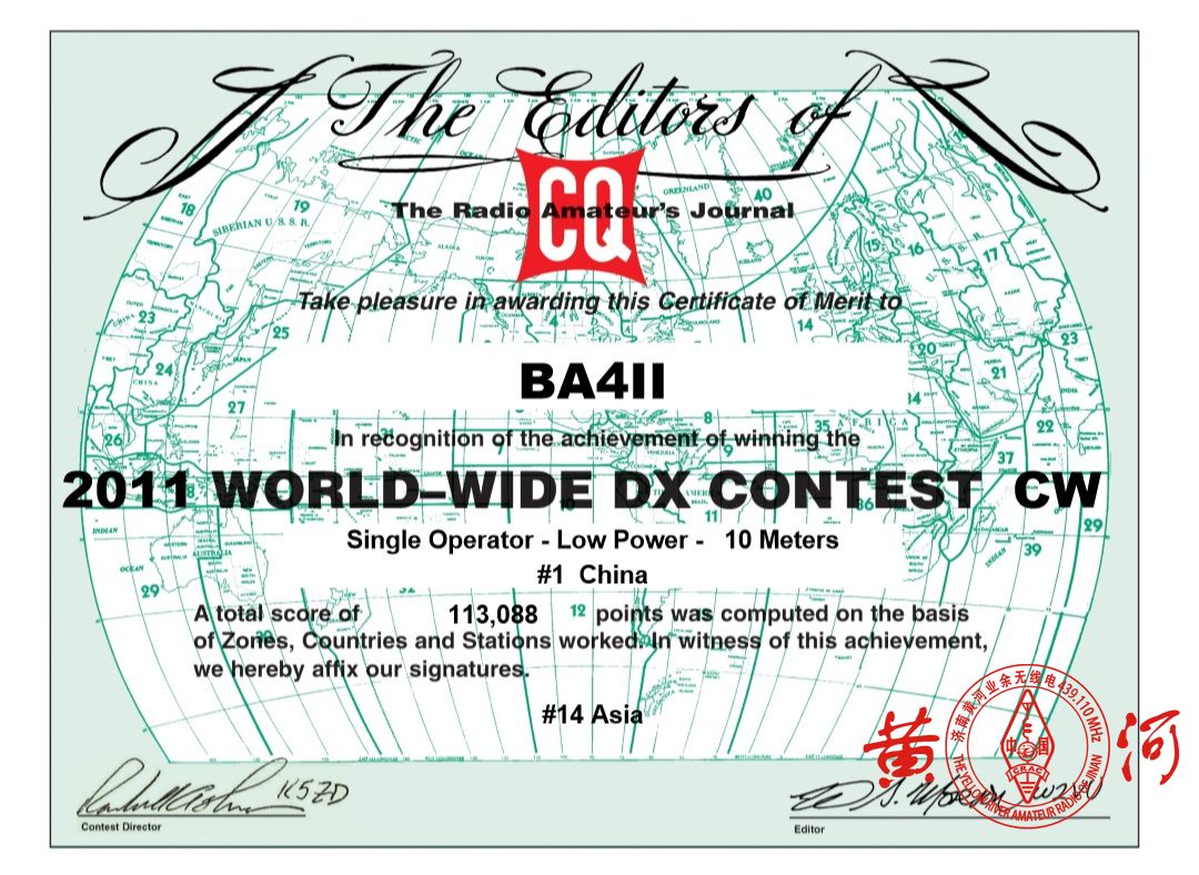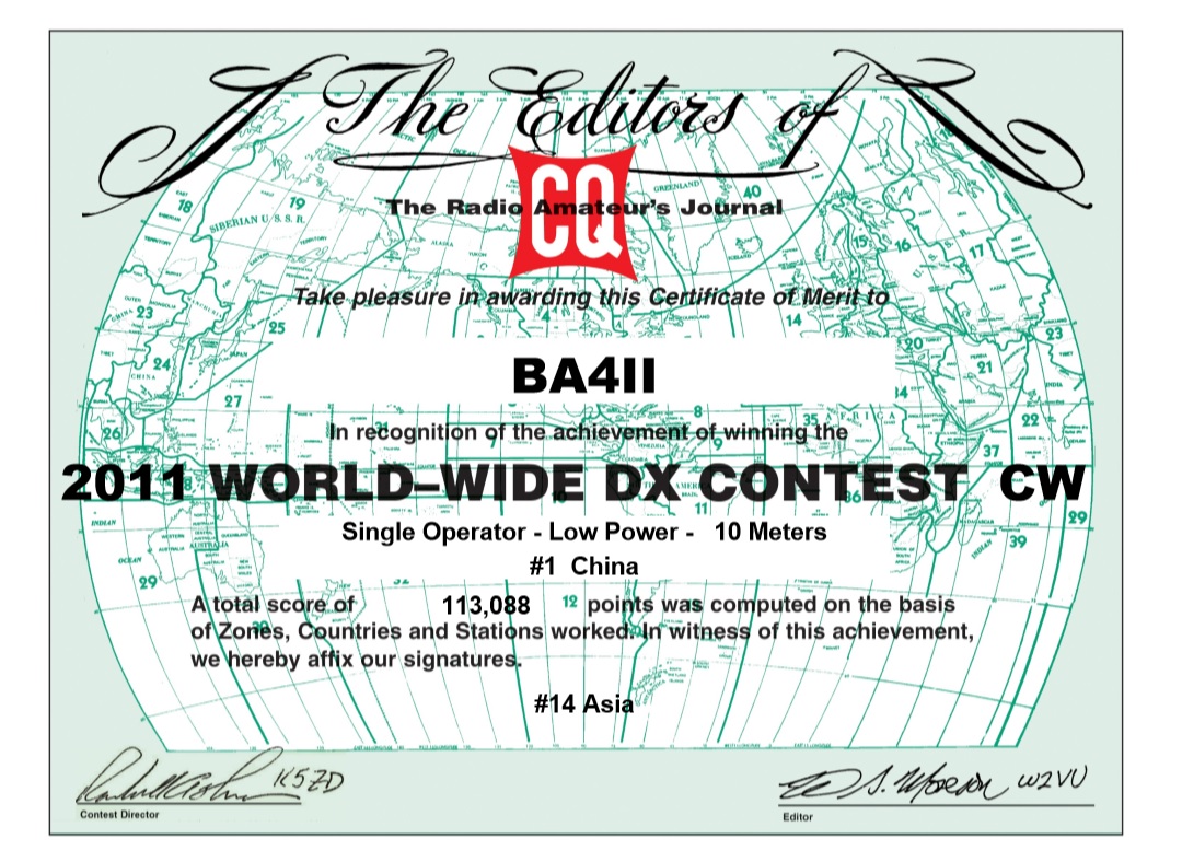 这是我参加2011年国际CQWW-CW比赛,10米段组,中国第一名。