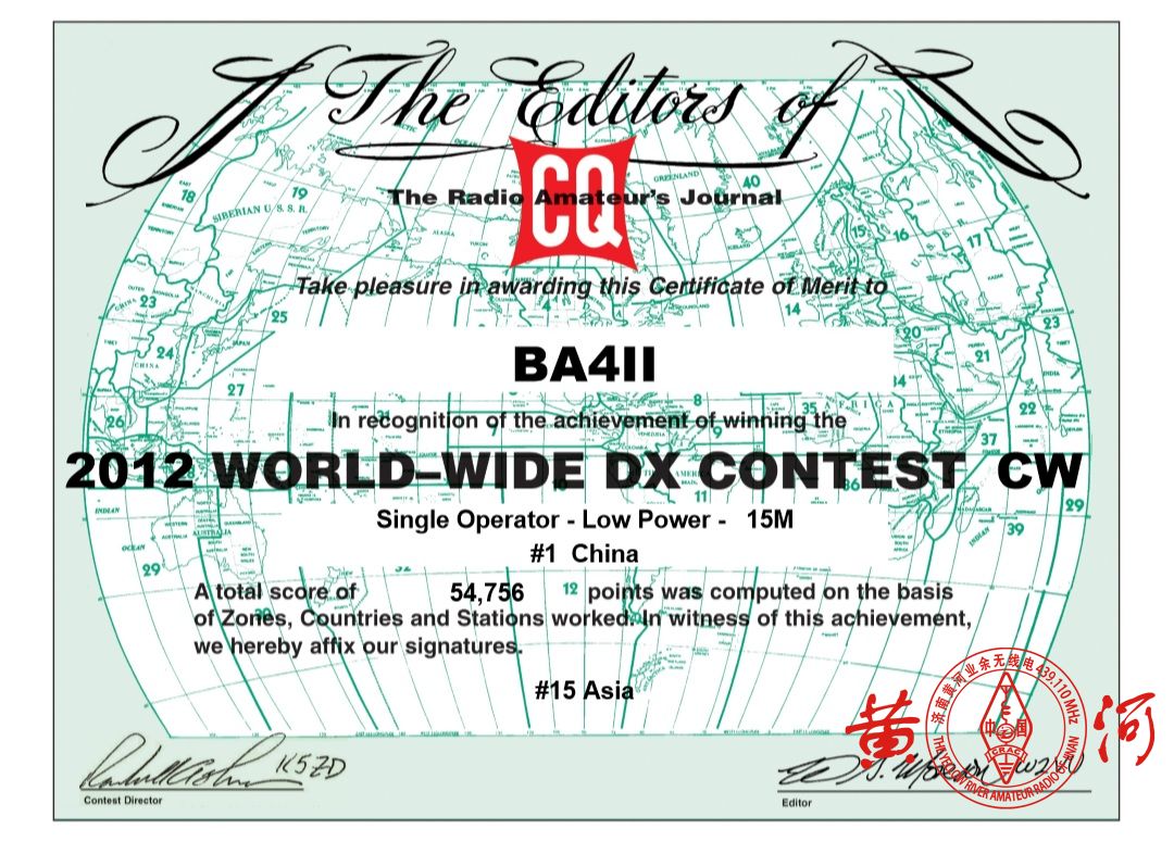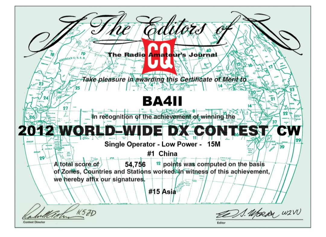 这是我参加2012年国际CQWW-CW比赛,15米段组,中国第一的成绩。