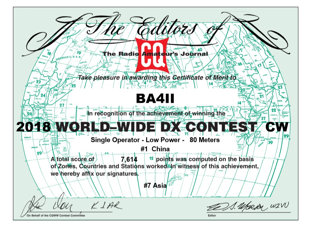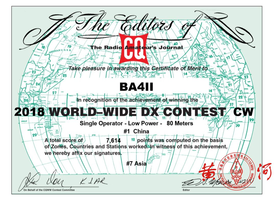 这是我参加2018年国际CQWW-CW比赛,80米段组获得中国第一名。