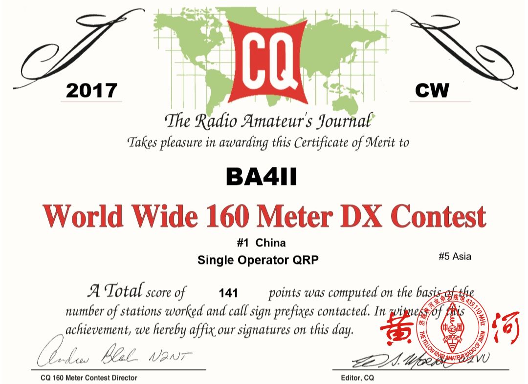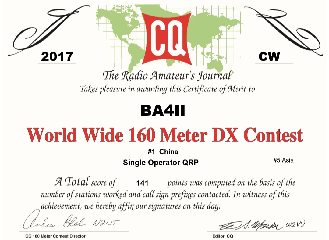 这是我参加2017年国际CQWW-WPX比赛,获得160米段,QRP组中国第一名。