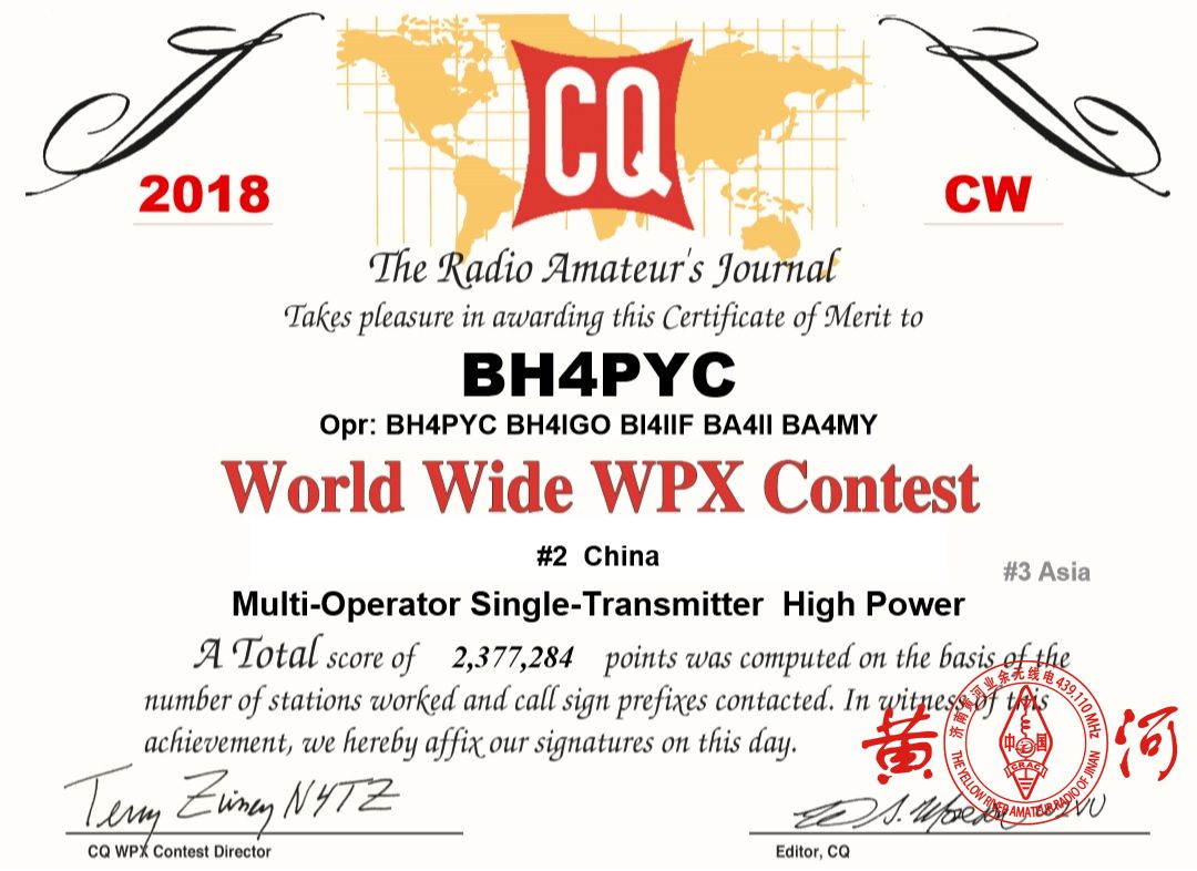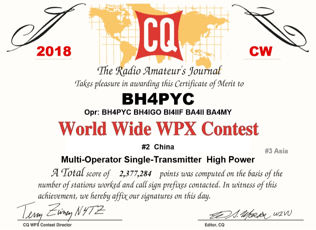 这是我在济阳HAM基地,参加2018年国际CQWW-WPX比赛,以BH4PYC集体台的名义获得的成绩。
