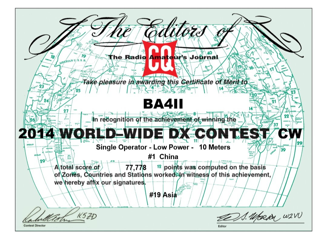 这是我2014年参加国际CQWW-CW比赛,10米段组取得中国第一名的成绩。
