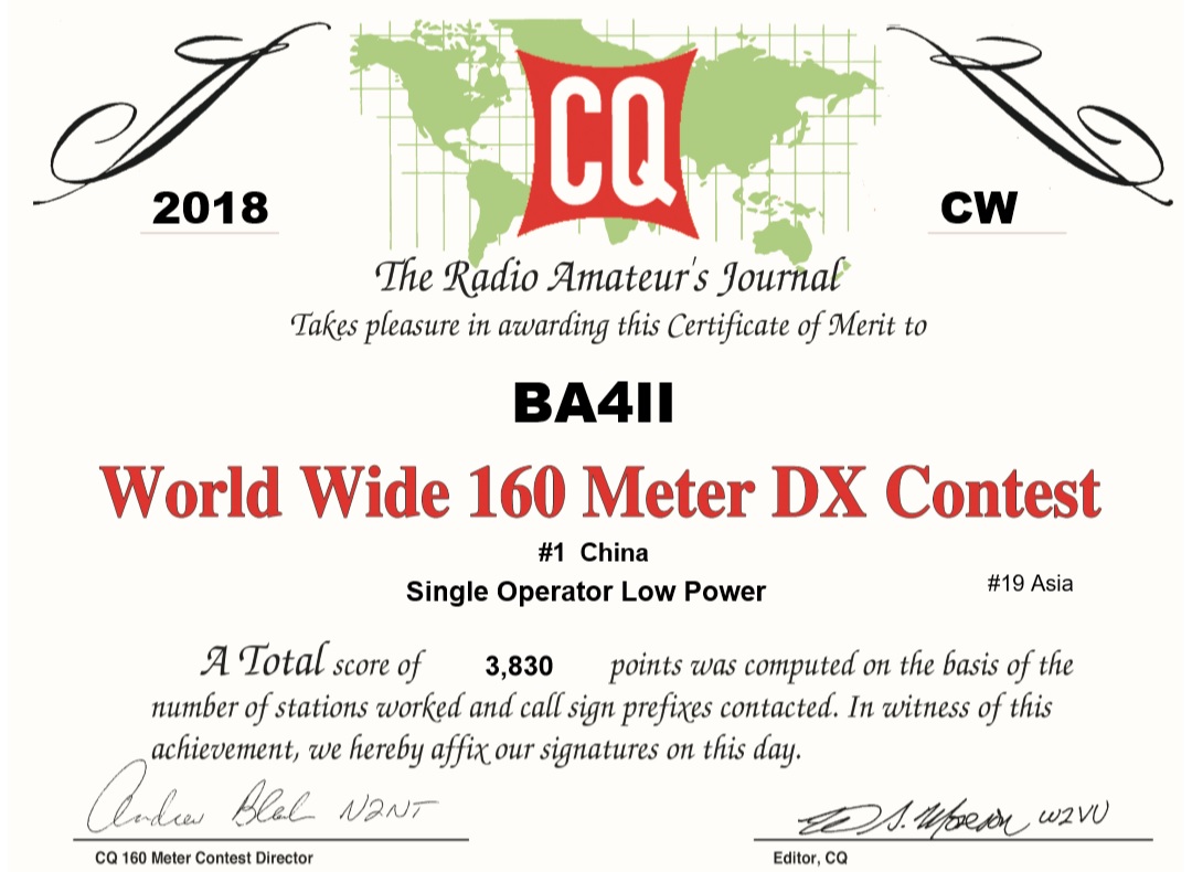 这是我在2018年参加国际CQWW-CW比赛,在160米段组获得中国第一名。