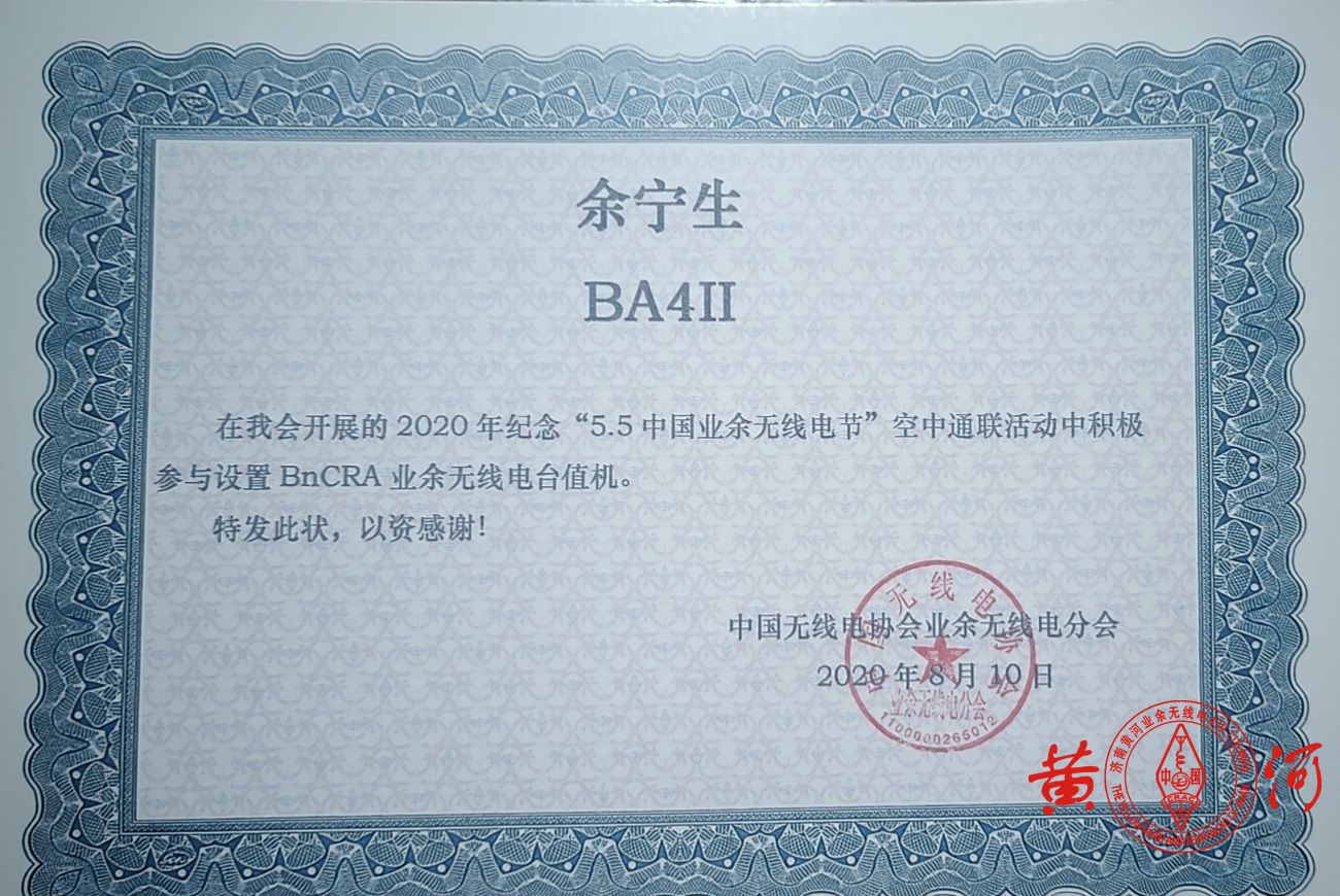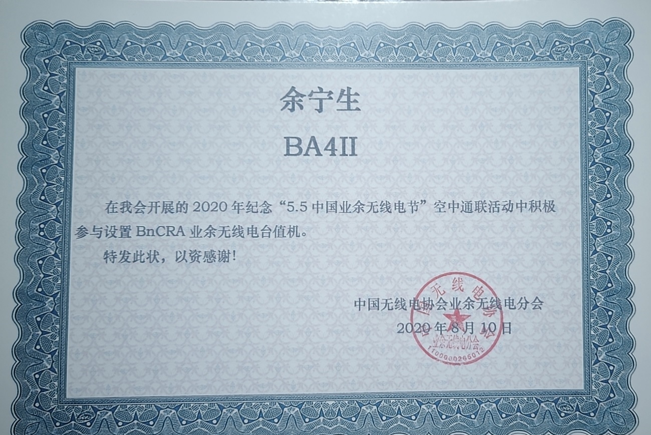 2020年我在55无线电节,我国组织的BnCRA比赛中,通联到从0到9区的所有主控台,共97个QSO,42个组合,超过金奖成绩标准,奖状虽然还没有收到,但先收到了值机员奖状,先高兴一下。