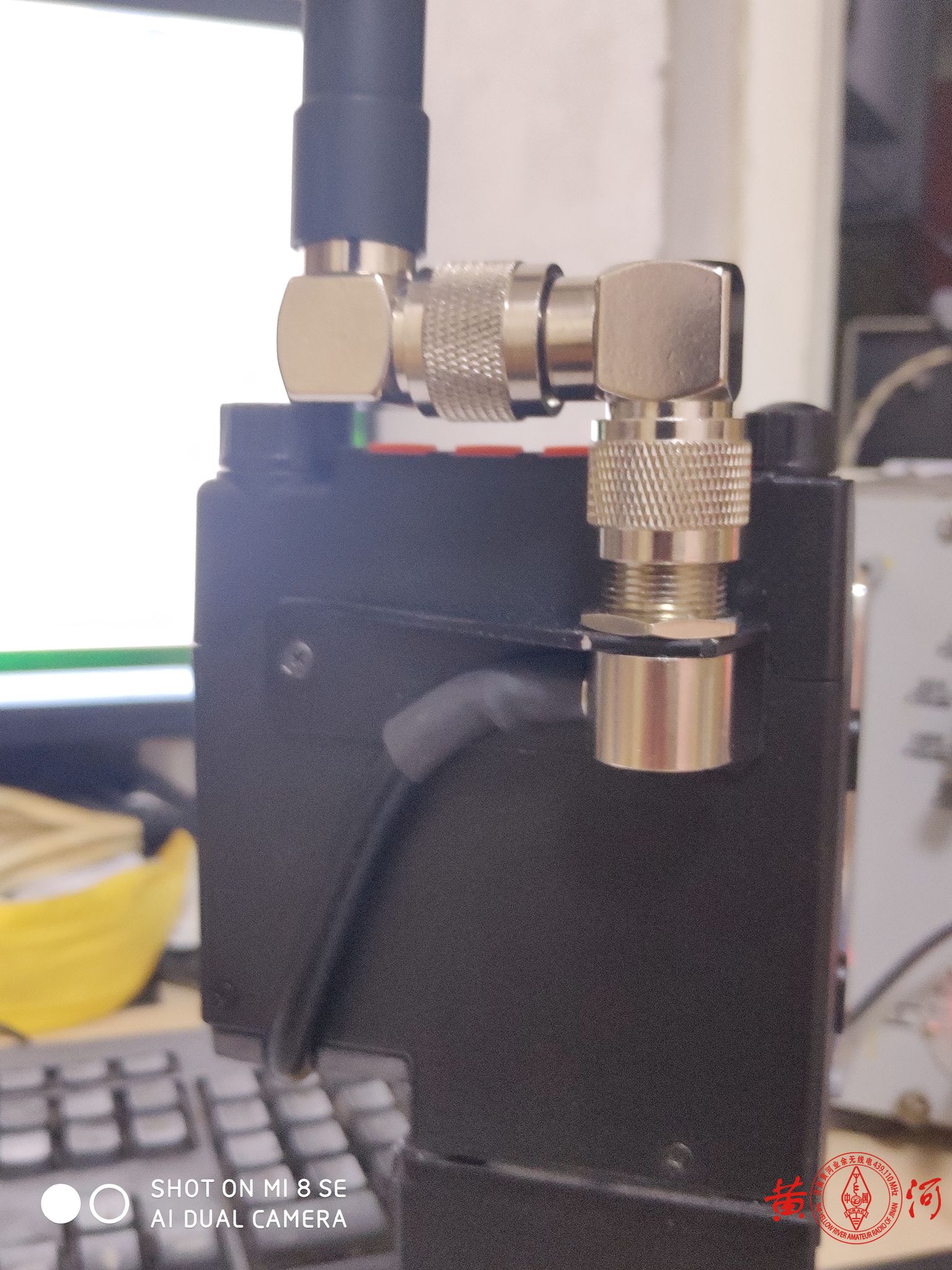 拆掉了原机天线接口,做了一个支架,将天线接口用50-5馈线和烟斗头改接到上端,串联两个90度转接头再接天线,这样可以随时将天线调整到90度垂直状态,连接手咪时可将手台平放使用。