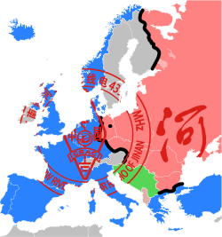 冷战时期的欧洲。黑色粗线为铁幕,浅红色为苏联及东方集团,浅绿色为南斯拉夫(实行不结盟政策),蓝色为以北约为框架的西方世界,灰色为保持中立的国家。