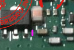 割完后。我们要做的就是给这个断口做一个开关,也就是上图的这两个位置,分别是功放管的右脚(上图红色)和电容左(上图紫色),这两个颜色分别焊一条引线出机子。不要过长.刚好出机子就行,注意不要短路.